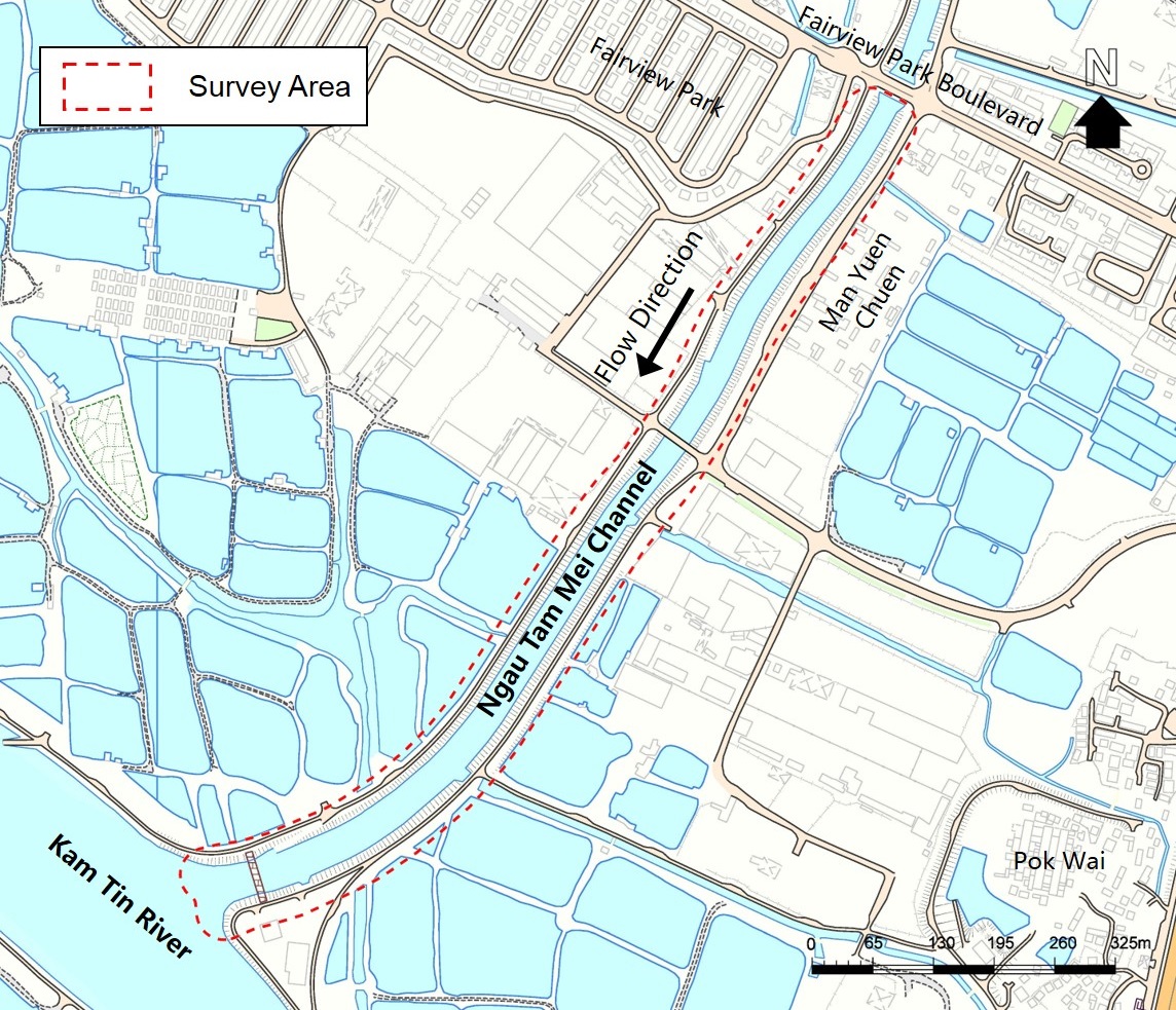 Ngau Tam Mei Channel is located in Yuen Long. It was channelized in 2005. It drains water from the Ngau Tam Mei area and flows into Kam Tin River.