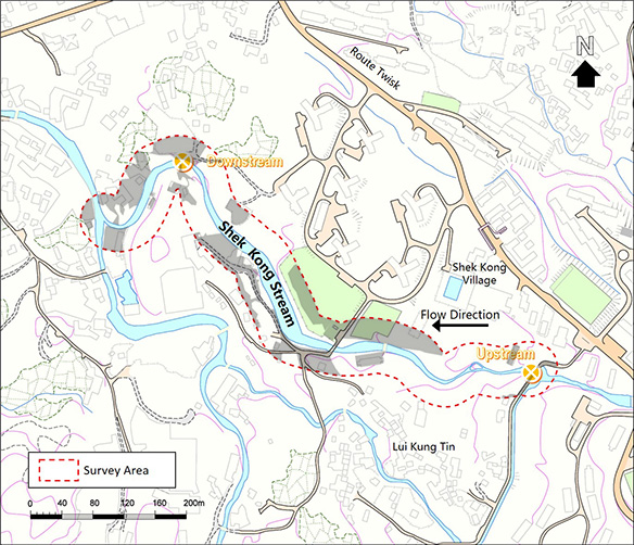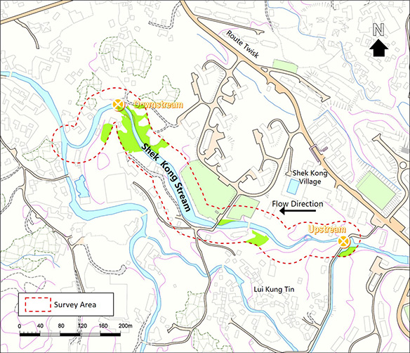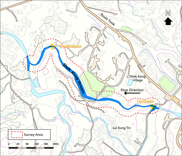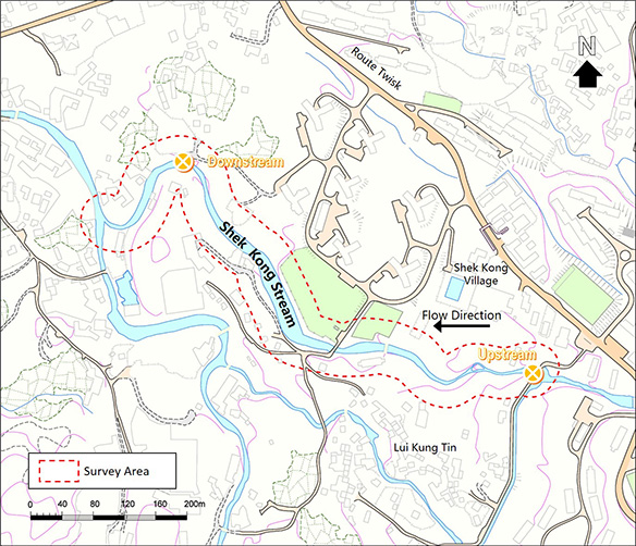 The Shek Kong Stream is located in Yuen Long, northwest New Territories. It is a channelized and semi-natural waterway. It drains the Kam Tin sub-catchment from Lui Kung Tin Tsuen down to Tai Ling and flows westward into the Kam Tin River.