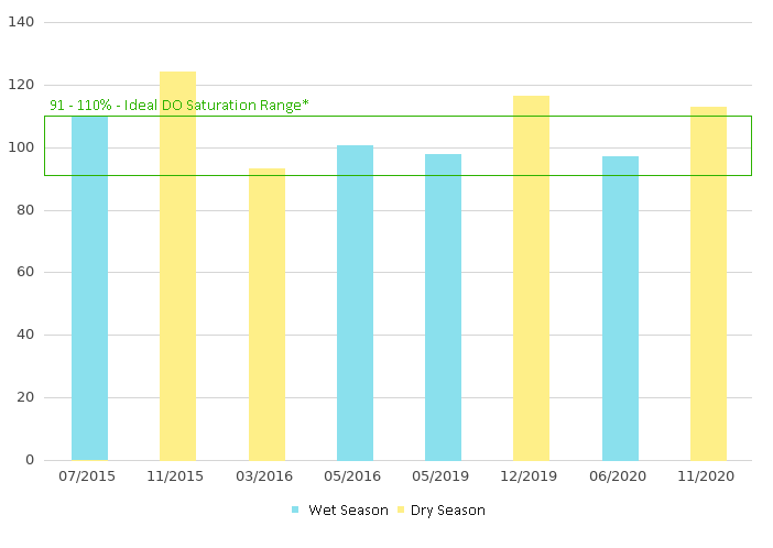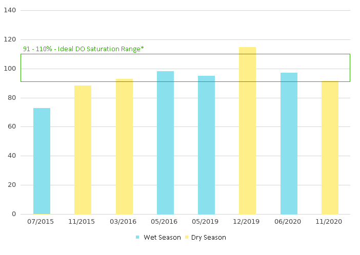 Dissolved Oxygen (DO) indicates the total amount of oxygen dissolved in the river channel water. DO supports aquatic fauna for respiration and maintenance of life. Dissolved Oxygen Saturation (DO (%)) falling in to 91 – 110% means excellent water quality with dissolved oxygen near or at saturation