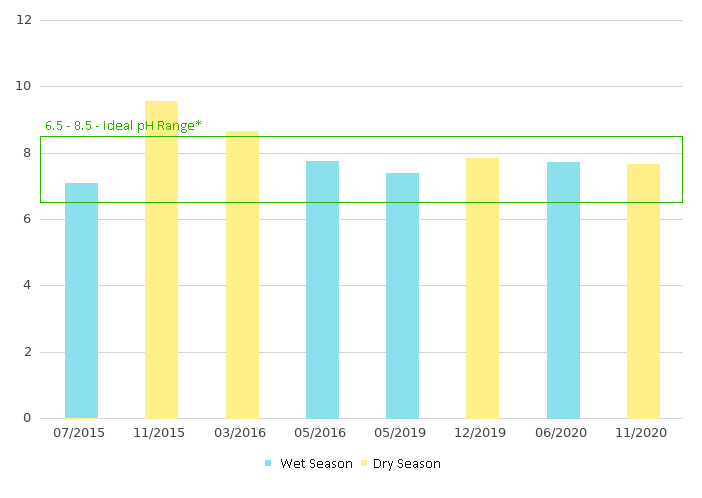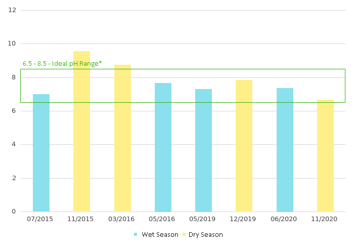 Provides indication of anthropogenic pollutants. pH falling into 6.5–8.5 indicating that there is unpolluted surface water supporting most of the aquatic biota.