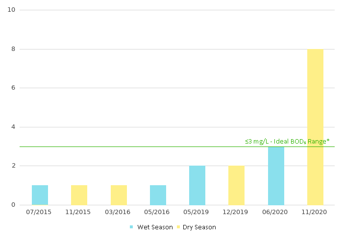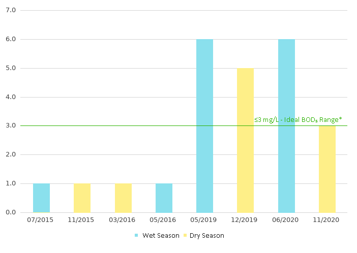 5-day Biochemical Oxygen Demand (BOD5) is the measure of the amount of dissolved oxygen consumed to break down organic material in five days by biological processes. High BOD5 level indicates water pollution. BOD5≤3 mg/L indicates excellent water quality