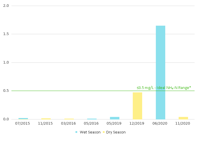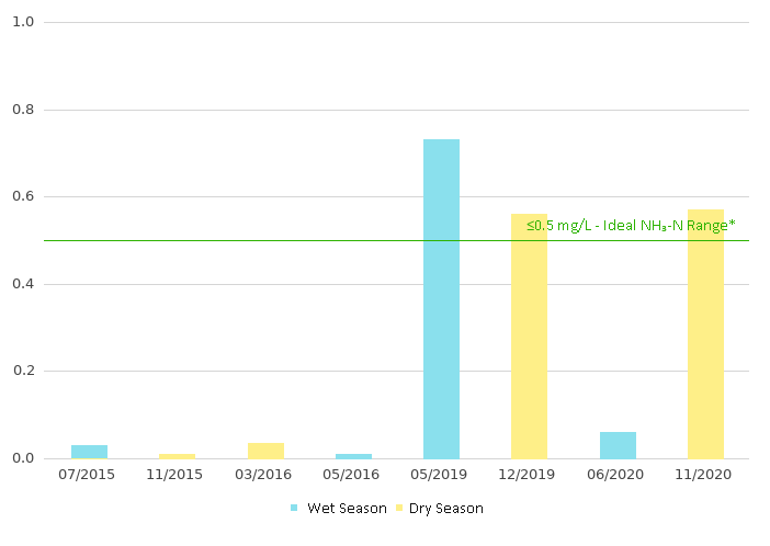 Ammonia-Nitrogen (NH3-N) Indicates the extent of organic contamination of the river channel. NH3-N < 0.5mg/L means that there is limited contamination by nutrient