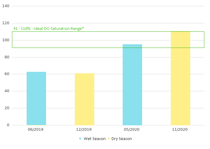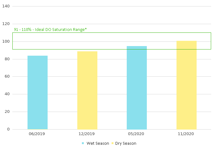 Dissolved Oxygen (DO) indicates the total amount of oxygen dissolved in the river channel water. DO supports aquatic fauna for respiration and maintenance of life. Dissolved Oxygen Saturation (DO (%)) falling in to 91 – 110% means excellent water quality with dissolved oxygen near or at saturation