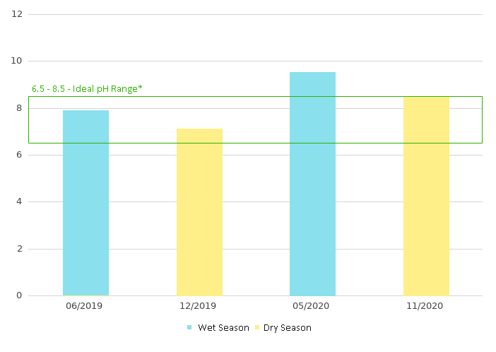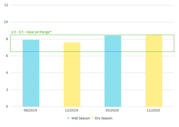 Provides indication of anthropogenic pollutants. pH falling into 6.5–8.5 indicating that there is unpolluted surface water supporting most of the aquatic biota.