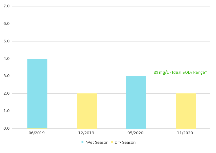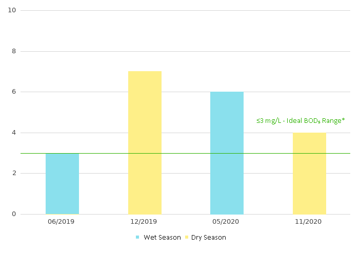 5-day Biochemical Oxygen Demand (BOD5) is the measure of the amount of dissolved oxygen consumed to break down organic material in five days by biological processes. High BOD5 level indicates water pollution. BOD5≤3 mg/L indicates excellent water quality