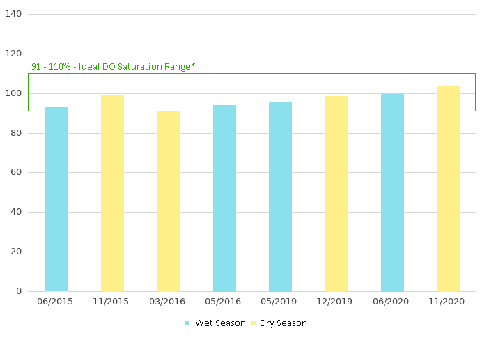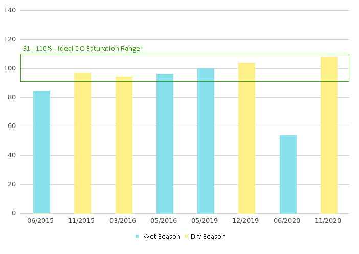 Dissolved Oxygen (DO) indicates the total amount of oxygen dissolved in the river channel water. DO supports aquatic fauna for respiration and maintenance of life. Dissolved Oxygen Saturation (DO (%)) falling in to 91 – 110% means excellent water quality with dissolved oxygen near or at saturation