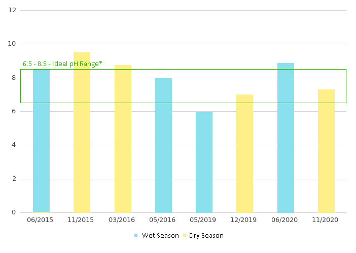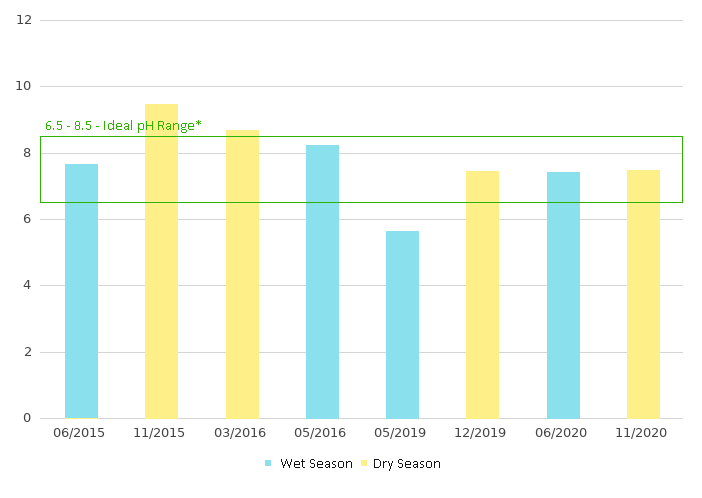 Provides indication of anthropogenic pollutants. pH falling into 6.5–8.5 indicating that there is unpolluted surface water supporting most of the aquatic biota.