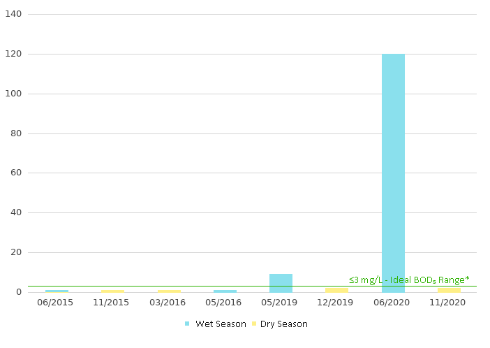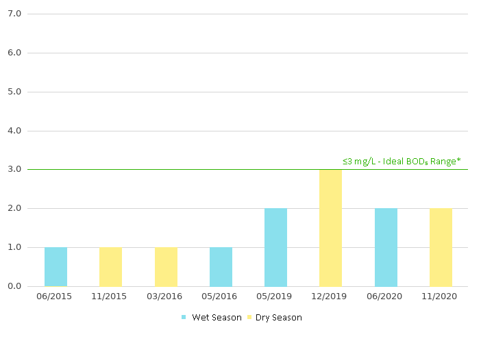 5-day Biochemical Oxygen Demand (BOD5) is the measure of the amount of dissolved oxygen consumed to break down organic material in five days by biological processes. High BOD5 level indicates water pollution. BOD5≤3 mg/L indicates excellent water quality