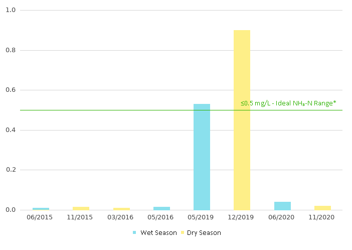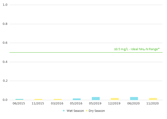 Ammonia-Nitrogen (NH3-N) Indicates the extent of organic contamination of the river channel. NH3-N < 0.5mg/L means that there is limited contamination by nutrient