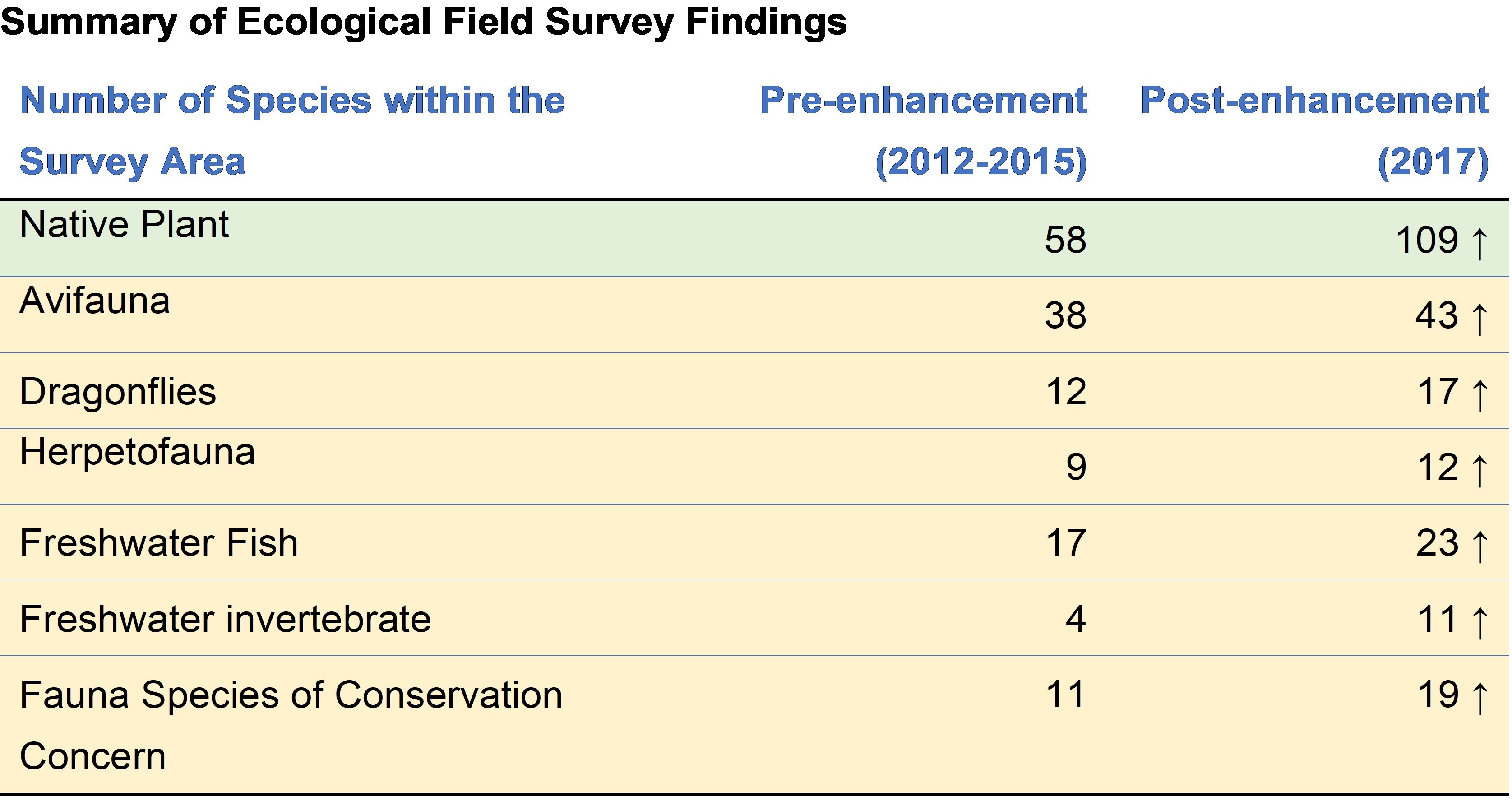During post-enhancement monitoring, the number of species for all fauna groups (including avifauna, dragonflies, herpetofauna, freshwater fish and freshwater invertebrates) along the survey area are higher than the number of species recorded in pre-enhancement surveys. One new species of conservation importance which are both native and wetland dependent utilising the enhanced section were recorded during post-enhancement surveys. More plant species were recorded along the watercourse of Lower Lam Tsuen River during post-enhancement surveys. More native and wetland dependent plant species were found along the water margin of the river channel which provide more micro-habitats for a variety of fauna. After the implementation of enhancement measures, some physical factors of the channels such as the number of types of aquatic habitats and the longitudinal connectivity of the channel have been improved. Riffles, pools and root of the vegetation mats, which provide a more diverse and complex habitat for wildlife, can be observed in the enhanced section. For the longitudinal connectivity, the presence of artificial features helps to mitigate flow blockage which allow movement of species along the river channel.