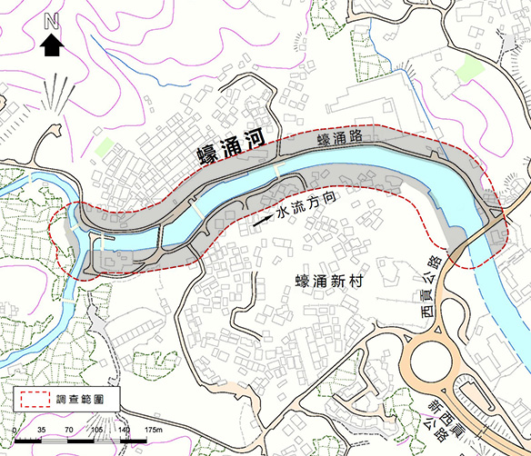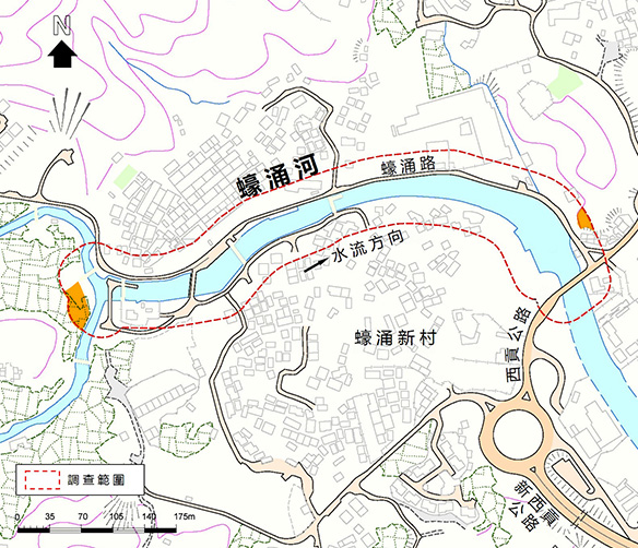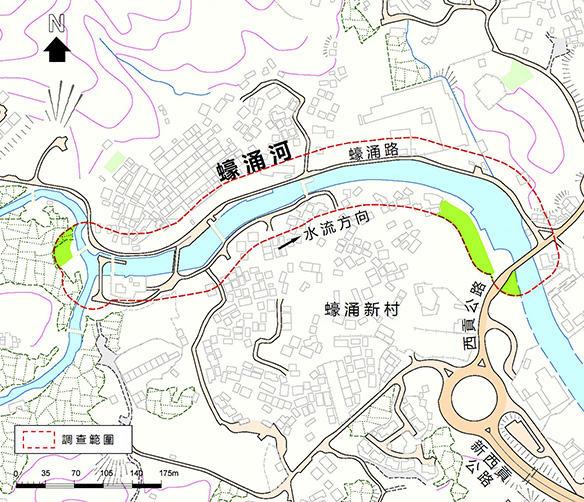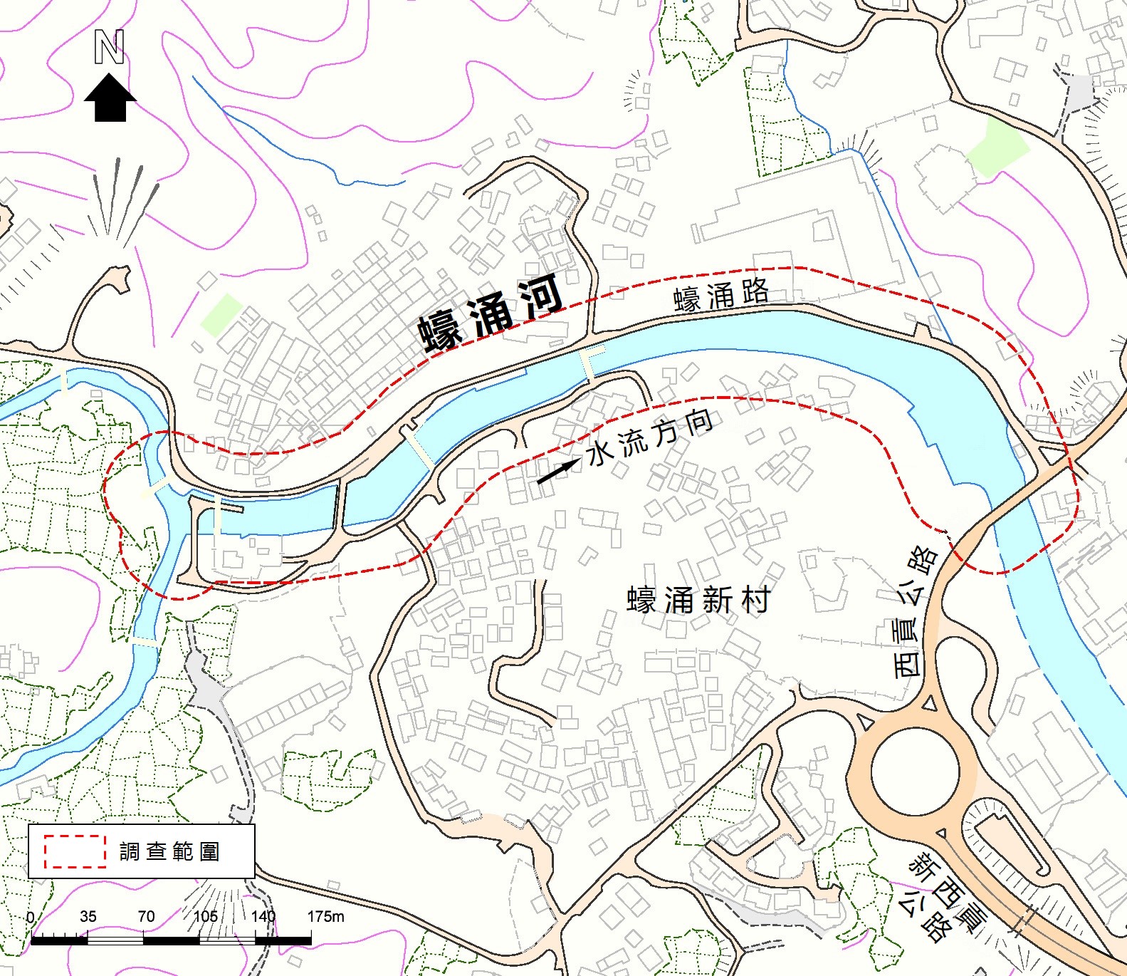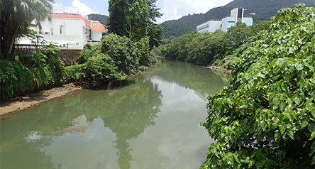 蠔涌河由天然河床、石籠和混凝土河堤構成,在上游河道上亦佈置了數排岩石,形成的微生境可提高生物多樣性,也為水生生物提供了不同的水深區域。