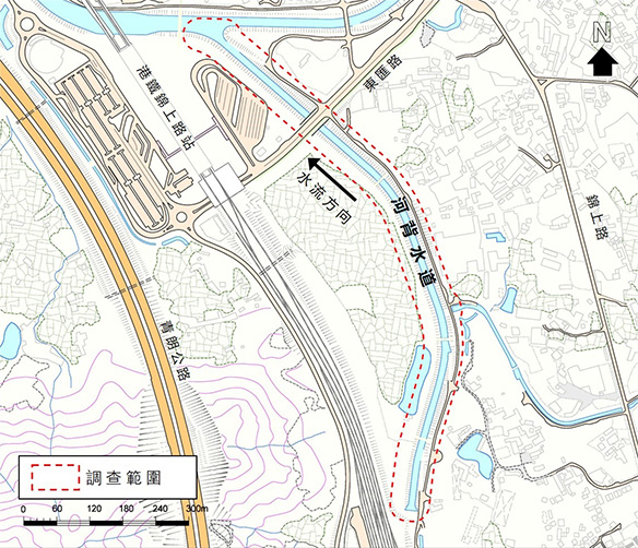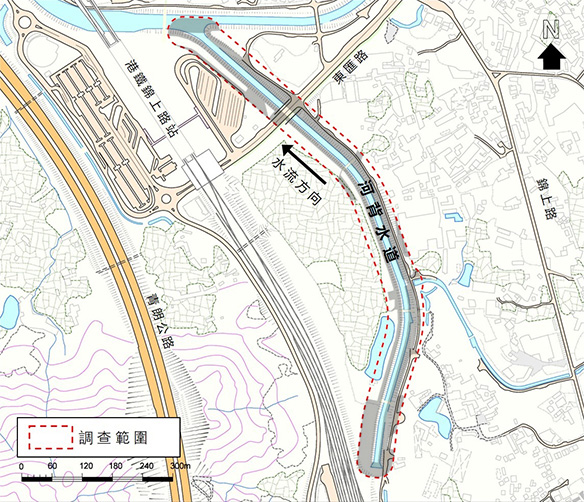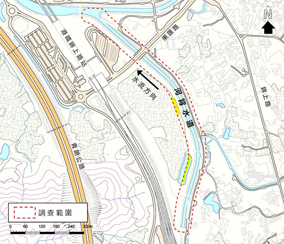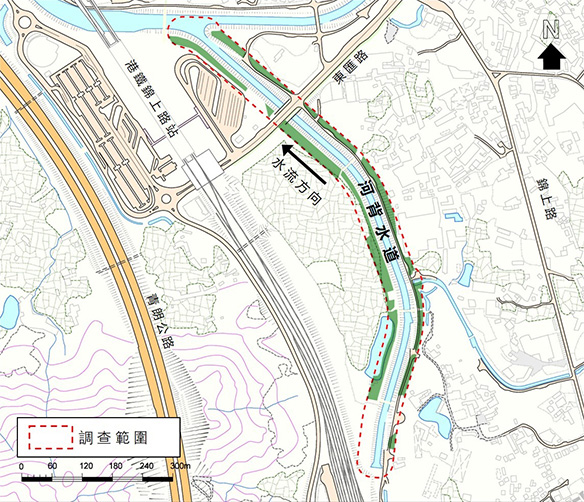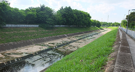 河道以混凝修建,河堤上安裝了植草磚。渠道底部只有少量的濕地植物,植草磚提供了植物的生長環境,上面覆蓋了草本植物和自生樹木。