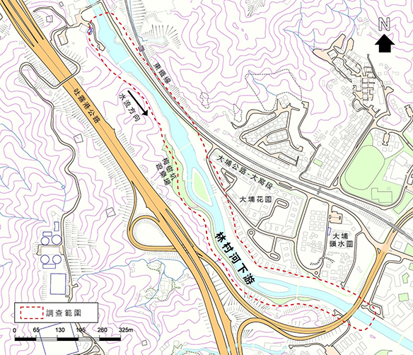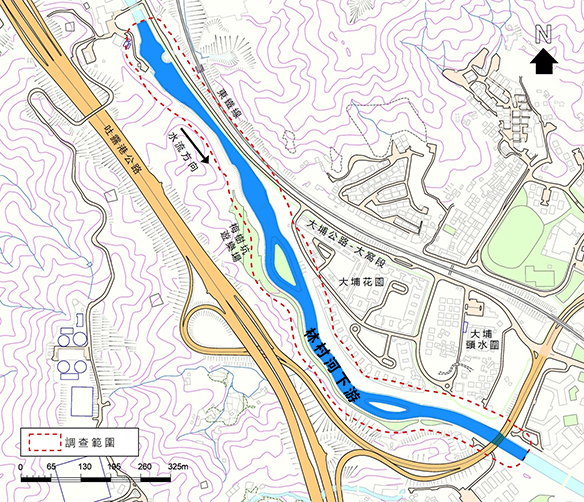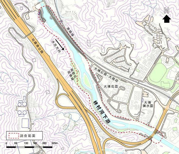 河道被植林圍繞,包括了梅樹坑遊樂場及梅樹坑路旁的常見的樹木和灌木。另外,接近調研範圍北面邊界生長著一小片由原生及外來樹木組成的植林。