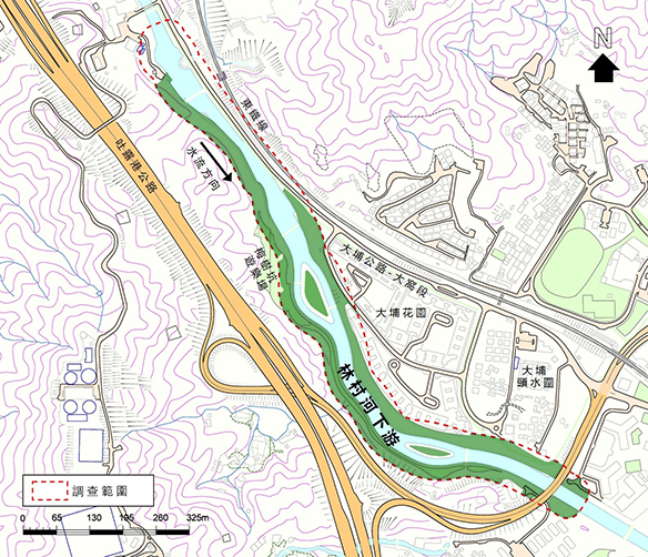 林村河下游位處於大埔,從林村谷向東流入吐露港,該人工河道由植草磚河底及樹島構成。於2015年未,渠務署在近梅樹坑遊樂場的河道開展了一次生態改善試驗研究 ,有關的試驗研究詳情,可按此處瀏覽。