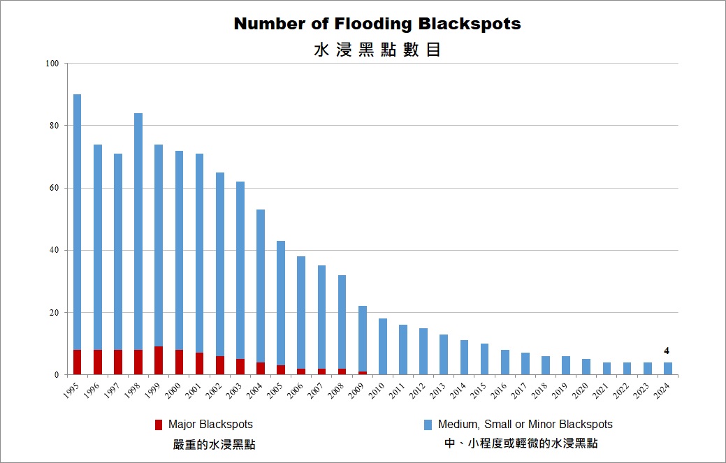 渠务署每年都会检视水浸黑点名单,亦会考虑是否增加或剔除水浸黑点。在考虑增加水浸黑点时,会参考该地点近年的水浸次数、范围和程度等因素。而在考虑是否剔除水浸黑点时,渠务署会检视该水浸黑点的改善工程是否已完成及启用,并会进行监察以确定成效。一般情况下,我们会监察约三个雨季及该地的降雨量,再检讨成效,并会于适当时侯予以剔除。