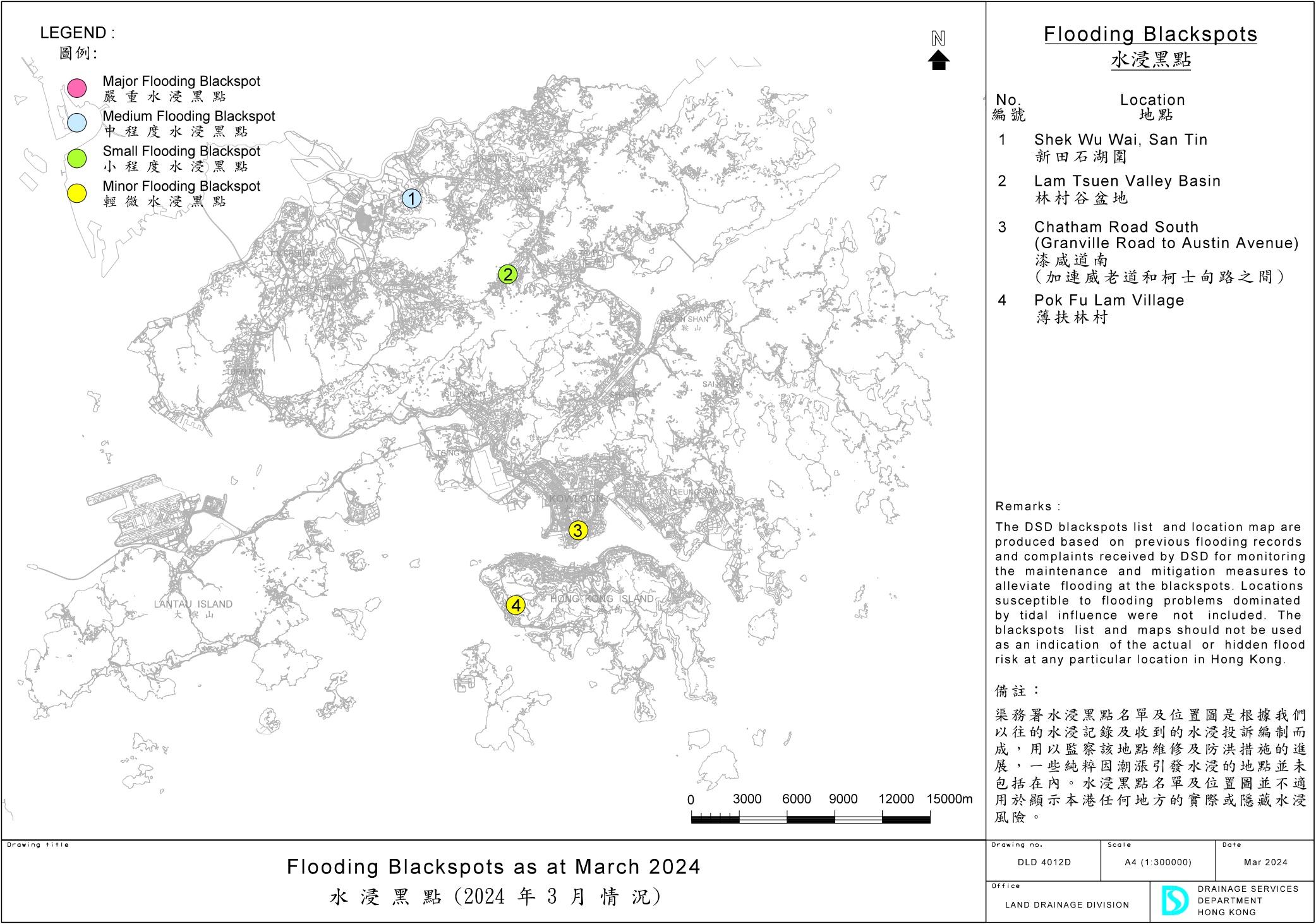 如果有关地点被列为水浸黑点,渠务署会为该水浸黑点评级。渠务署会按受影响地点的水浸范围及程度,把水浸黑点分为四个等级,包括:严重(第4级)、中程度(第3级)、小程度(第2级)和轻微(第1级)。水浸黑点等级的定义:
