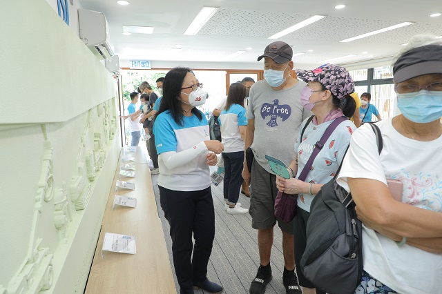 渠务署今明两日(八月二十七日至二十八日)举办搬迁沙田污水处理厂往岩洞社区联络中心开放日。图示渠务署署长彭雅妮(左一)向市民介绍岩洞工程的特色。