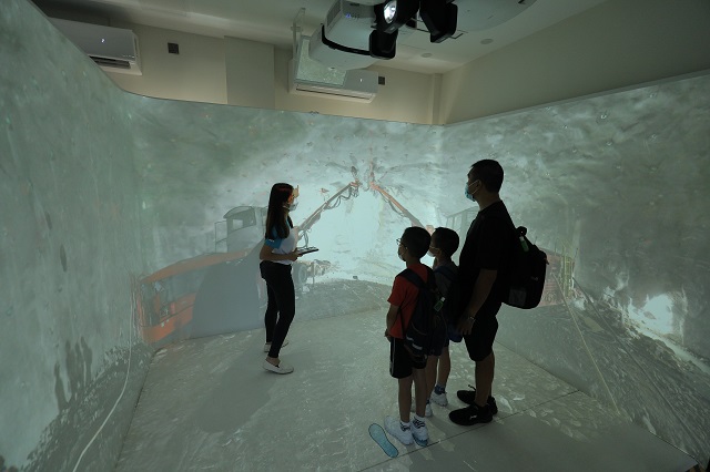 渠务署今明两日(八月二十七日至二十八日)举办搬迁沙田污水处理厂往岩洞社区联络中心开放日。图示市民使用「洞穴式虚拟系统」。