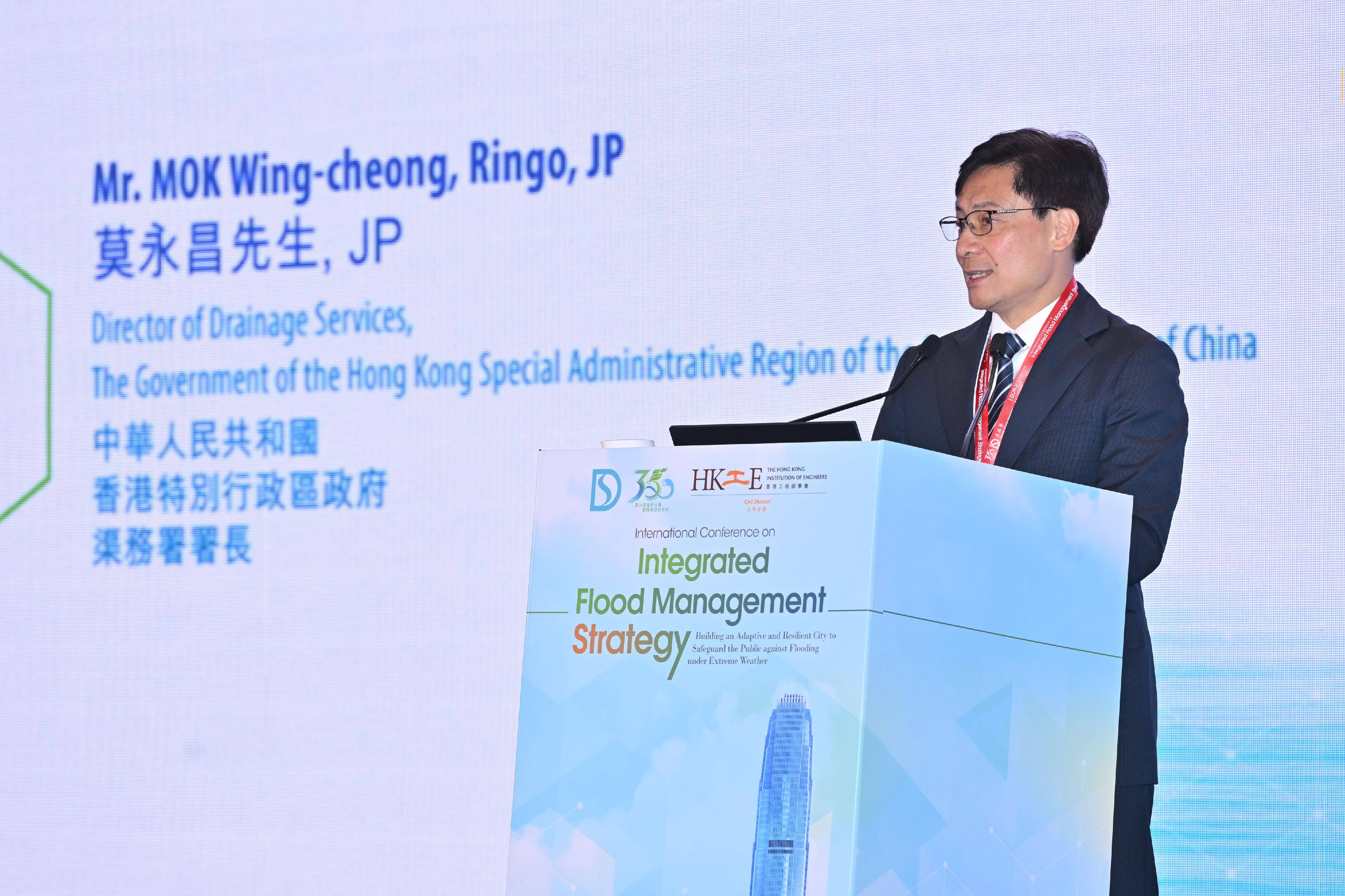 由渠务署与香港工程师学会土木分部合办的综合防洪管理策略国际会议今日(十二月三日)举行,以促进防洪合作与经验分享,推动全球综合防洪管理策略发展。图示渠务署署长莫永昌在开幕礼致辞。