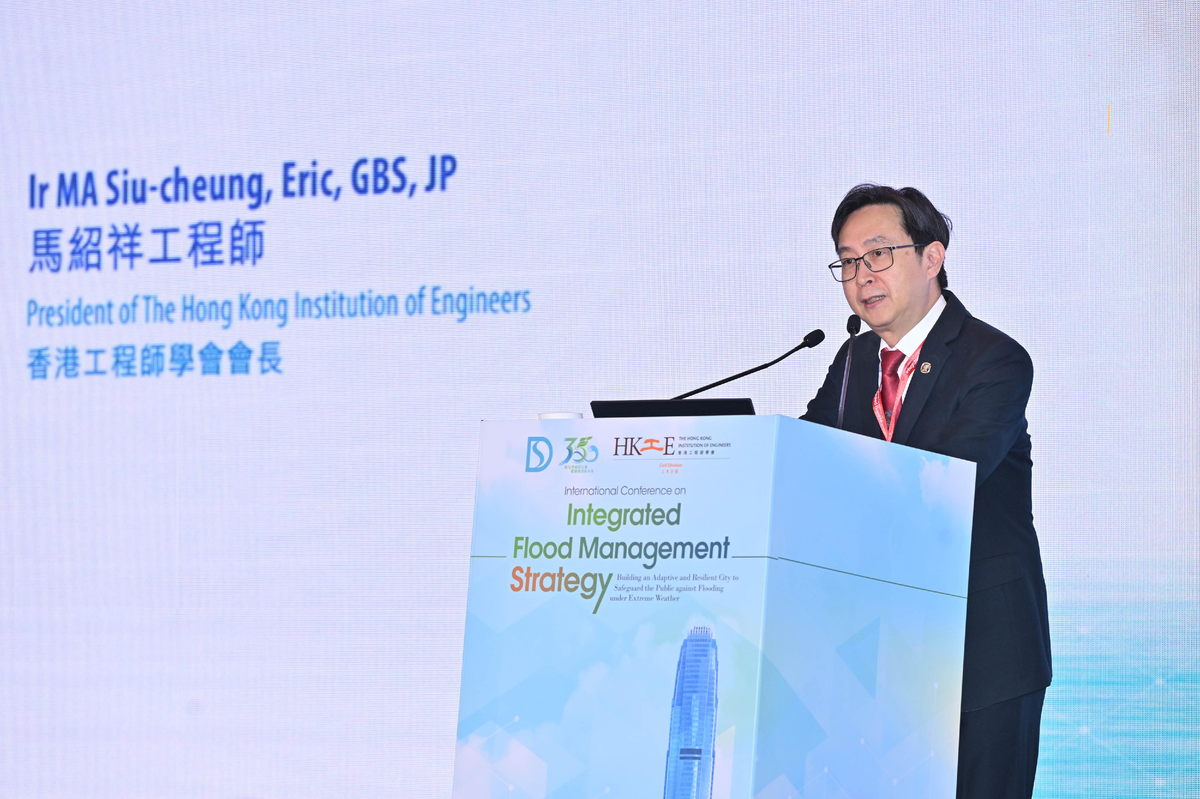 由渠务署与香港工程师学会土木分部合办的综合防洪管理策略国际会议今日(十二月三日)举行,以促进防洪合作与经验分享,推动全球综合防洪管理策略发展。图示香港工程师学会会长马绍祥在开幕礼致辞。