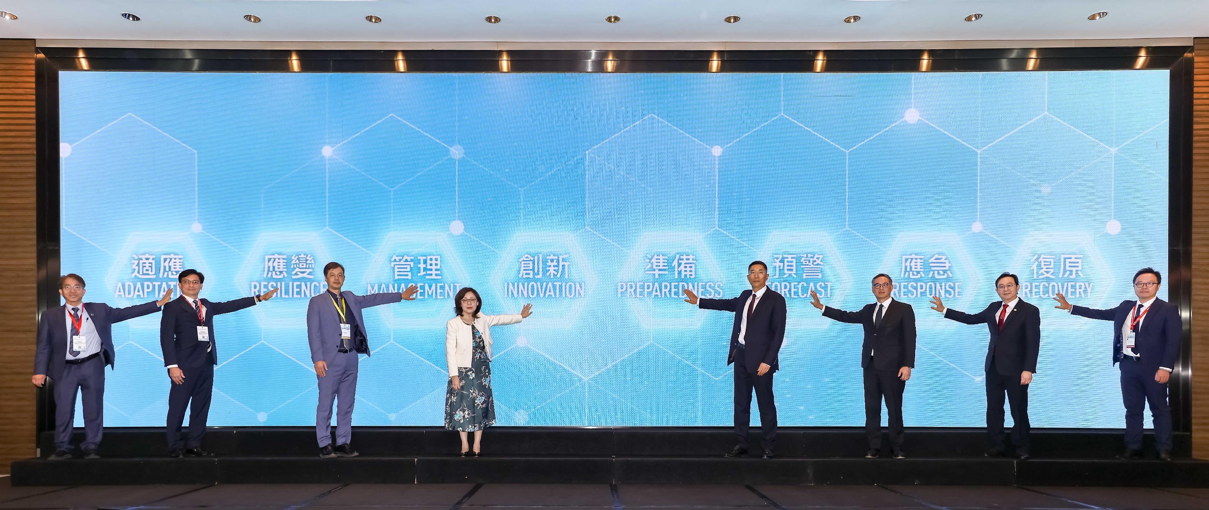 由渠务署与香港工程师学会土木分部合办的综合防洪管理策略国际会议今日(十二月三日)举行,以促进防洪合作与经验分享,推动全球综合防洪管理策略发展。图示(左起)澳门科技大学副校监兼校长李行伟教授、渠务署署长莫永昌、清华大学土木水利学院副院长赵建世教授、发展局局长甯汉豪、国家水利部珠江水利委员会主任吴小龙、发展局常任秘书长(工务)刘俊杰、香港工程师学会会长马绍祥和香港工程师学会土木分部主席李振辉主持开幕典礼。