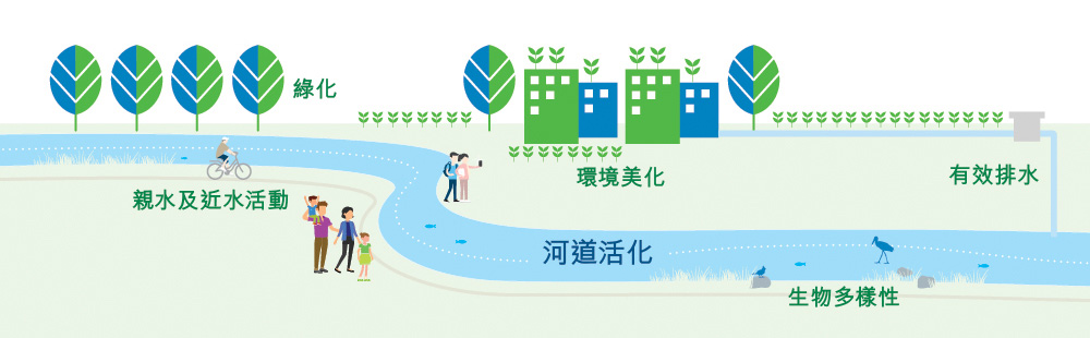 我们以具经济效益及合乎生态的方式,提升排洪服务并引进具绿化和生态保育元素的可持续排水系统,包括种植多样植物及营造天然溪涧环境,以保育河道生态系统及促进生物繁衍,增加河道生物多样性。总括而言, 除有效排水外,我们致力活化河道,并加入绿化元素、美化景观、促进生物多样性及亲水和近水活动等目标,务求建设可持续排水设施,以营造更美好的居住环境。