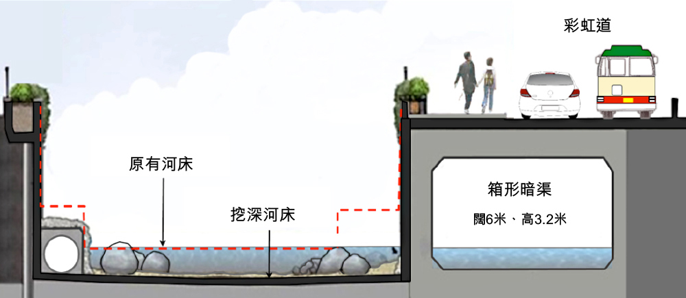 工程包括挖深原有河床,以及在彩虹道地底加建长400米的箱形暗渠。