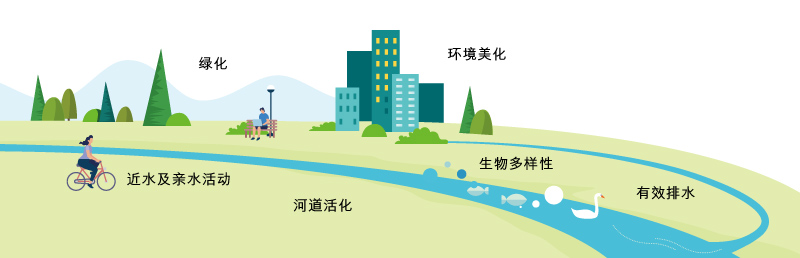 活化水体不但美化环境,同时提升河道生态及生物多样性价值,以及绿化及美化河道。我们更会致力推广近水和亲水活动,让市民享用河道设施、体验水体多功能的价值、珍惜水体及共同缔造美好居住环境。