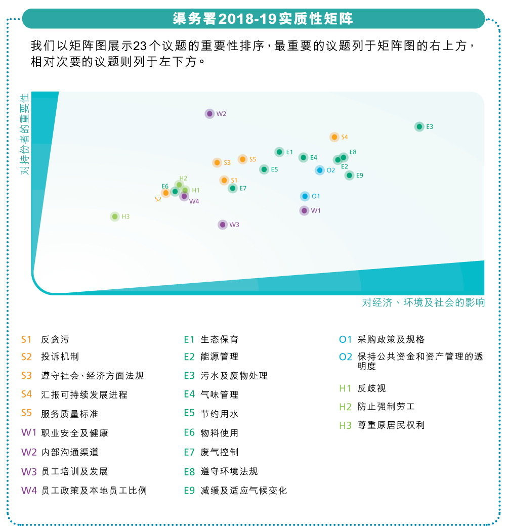 于本报告期内,我们与260位外部和96位内部持份者进行意见调查,以确定所识别的实质性议题的优先次序,及于焦点小组讨论各实质性议题的影响。我们根据焦点小组讨论及问卷调查的分析结果绘制了实质性矩阵。本年度渠务署优先处理及报告的实质性议题共有18个。