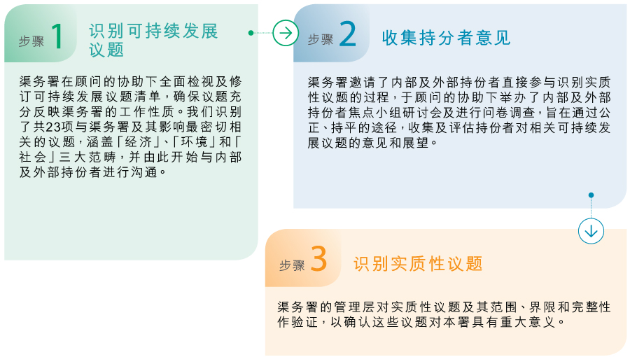 渠务署每年均会进行一次全面的实质性评估,以识别本署及持份者最为关切的经济、环境和社会议题,并使每年度可持续发展报告的内容更具针对性。我们根据GRI标准对议题进行实质性议题评估,以识别对本署及持份者影响较大的议题,2018/19年度的实质性议题评估过程由以下3个主要步骤组成6: