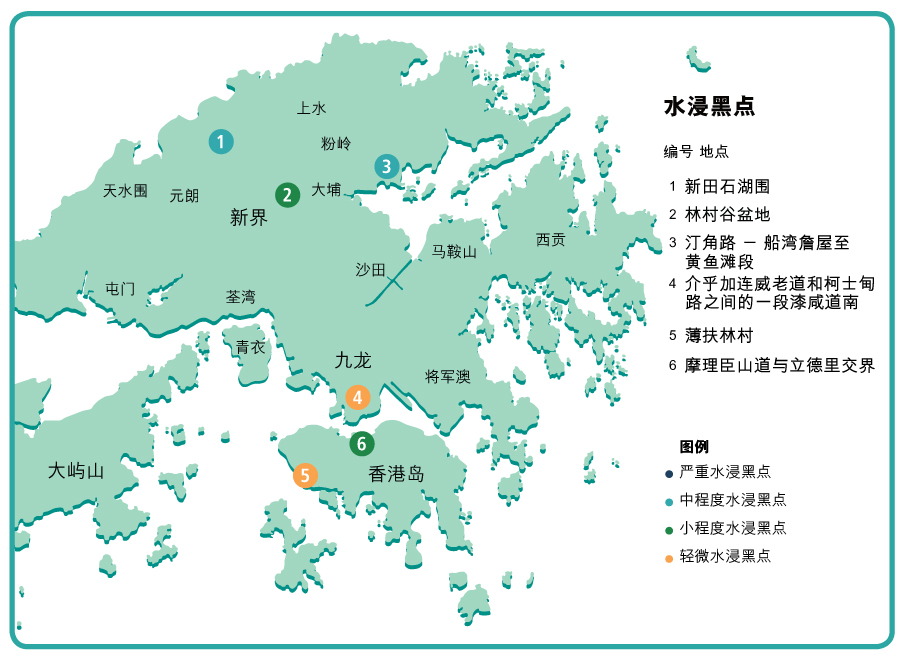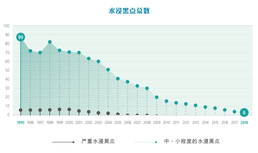 我们于过去一年进行了不同的排水系统改善工程,并于2019年年初为各项已完成的排水系统改善工程进行成效评估。现时全港剩余6个水浸黑点,余下水浸黑点中,2个黑点的改善工程经已完成,我们现正监察工程成效。此外,为尽早剔除所有水浸黑点,其余4个黑点的第一阶段改善工程已完成;我们现正规划和设计下一阶段工程,并会在雨季期间密切监察该等地区的排水情况。