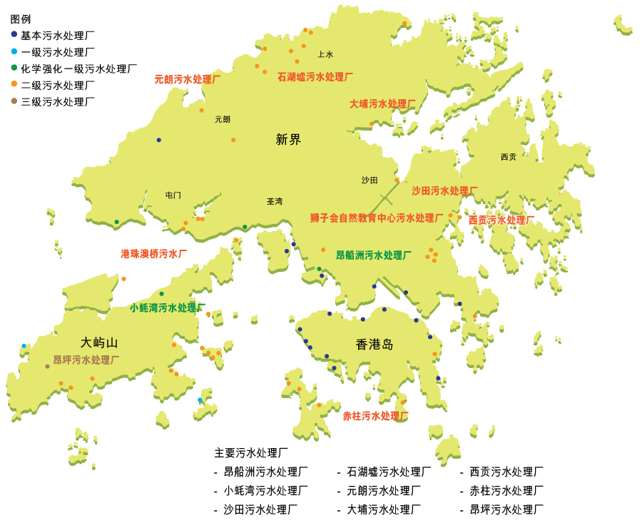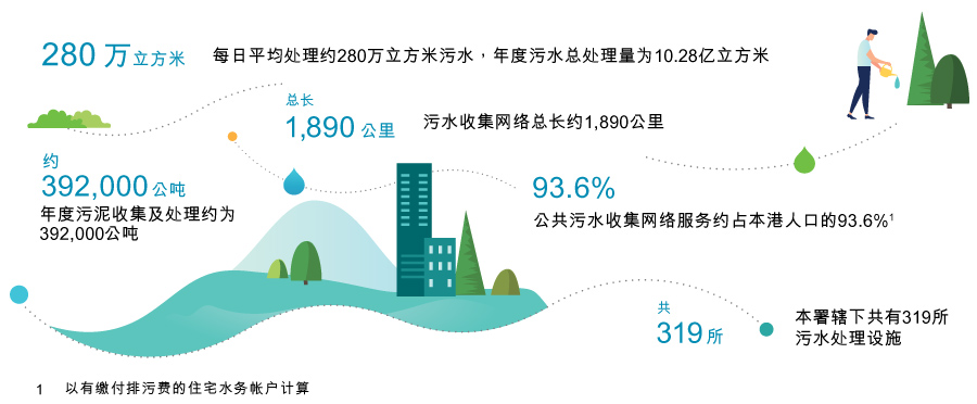 除了疏导雨水,收集、处理及排放本港日常产生的污水亦是本署核心服务之一。本署致力提供世界级污水处理服务,透过不同污水处理程序及先进技术,大大减低污染物排放。我们亦定期进行维修保养工作,确保污水收集、处理和排放设施有效运作。展望未来,我们会继续扩大污水收集系统的覆盖范围,并持续改善污水处理设施,保护本港水域水质,促进香港可持续发展。
