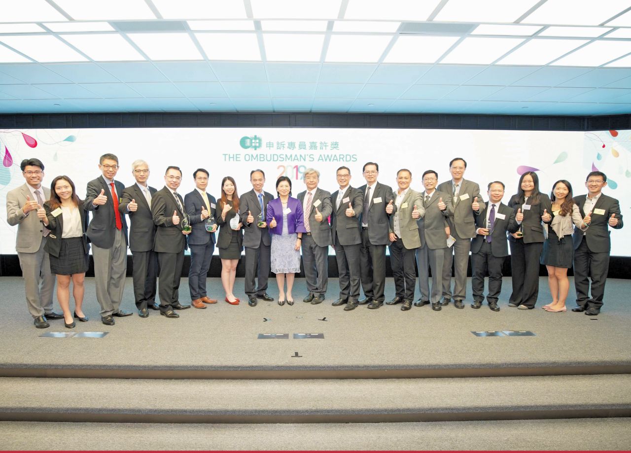 渠务署工程师李晓君女士(左七)和何存仁先生(左八)荣获「2019年申诉专员嘉许奖」的公职人员奖项。