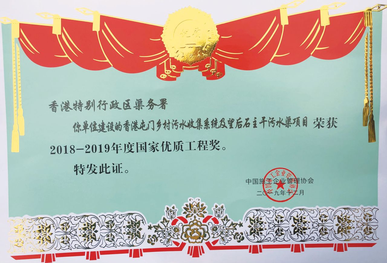 本署屯门乡村污水收集系统及望后石主干污水渠工程项目荣获2019国家优质工程奖。