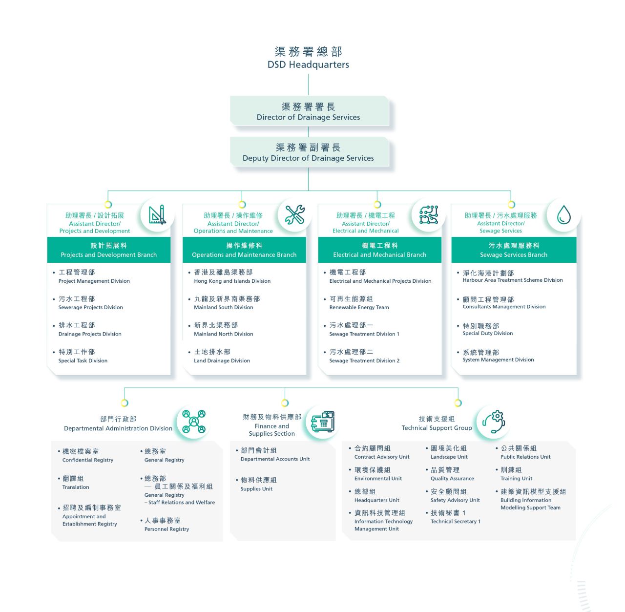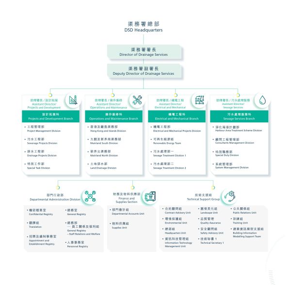 本署设有四个分科,包括污水处理服务科、操作维修科、设计拓展科及机电工程科,下设16个不同功能的分部。此外,总部另设部门行政部、财务及物料供应部,以及技术支援部,分别负责行政、会计及技术支援工作。截至2020年3月,编制共有 2,020个常额职位。