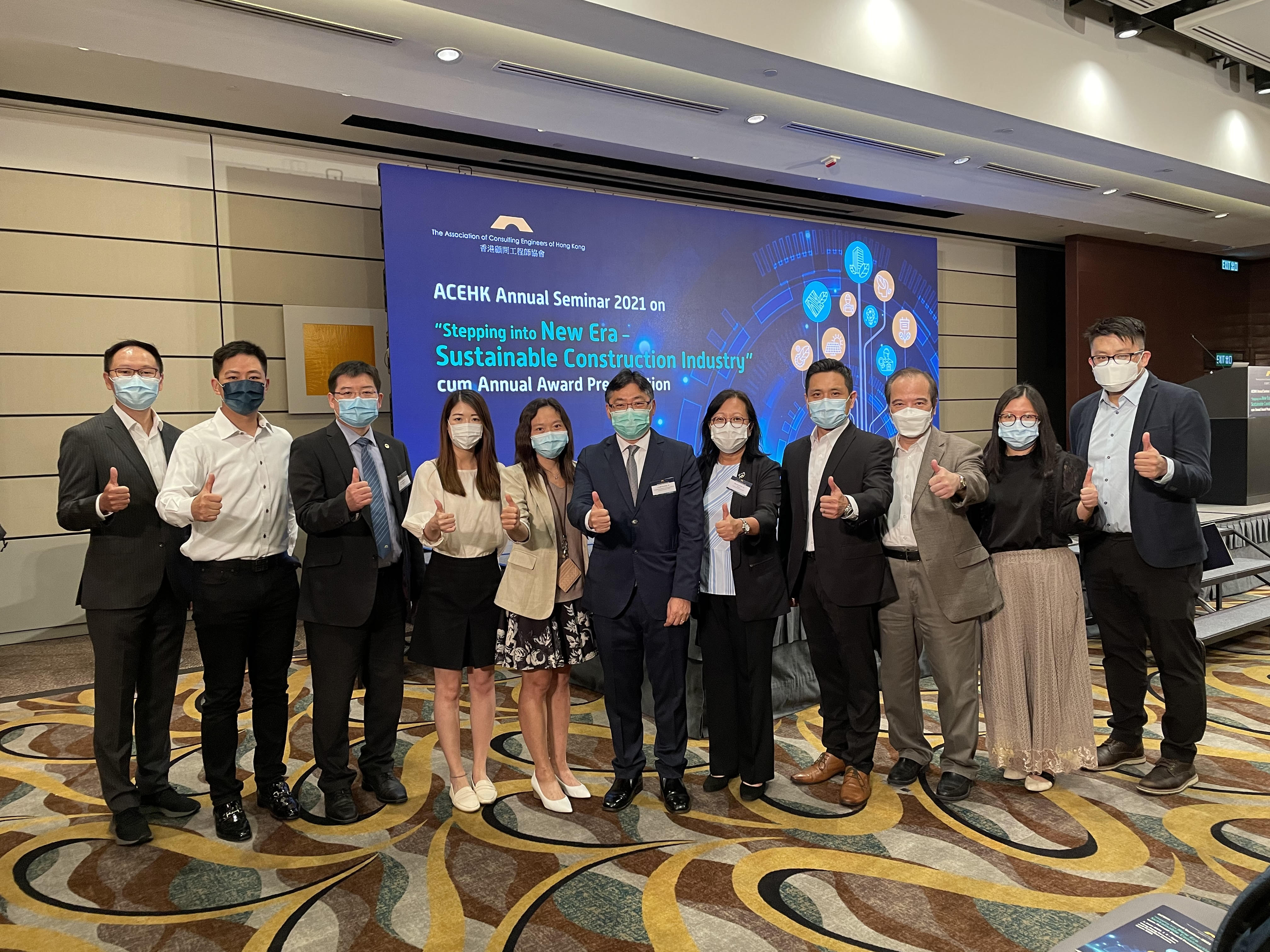 渠务署、工程顾问及承建商团队的代表出席2021年6月1日的颁奬仪式。工程团队与发展局常任秘书长(工程)林世雄先生(左六)、渠务署署长彭雅妮女士(右五)及总工程师/顾问工程管理何家仪女士(左五)合照。