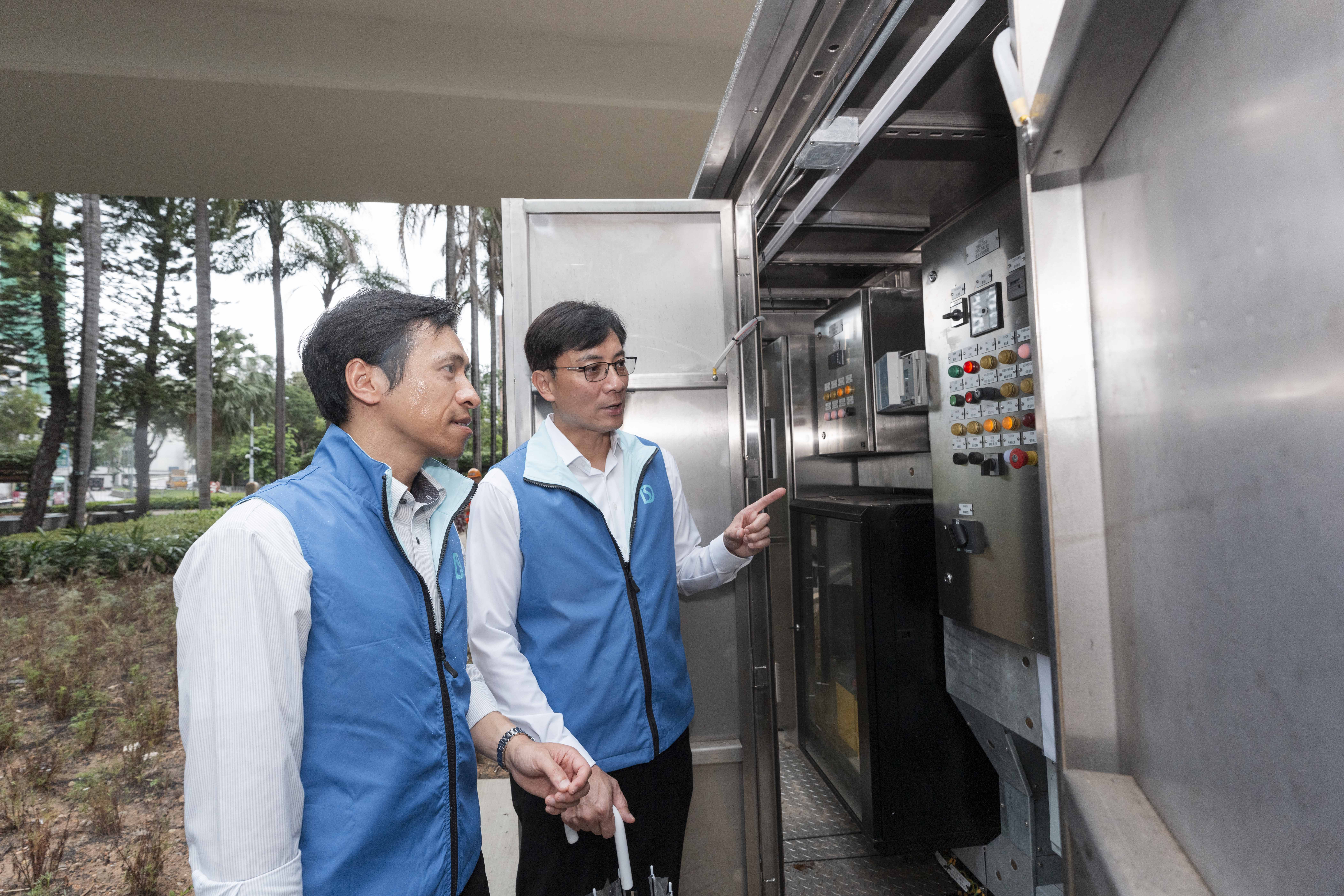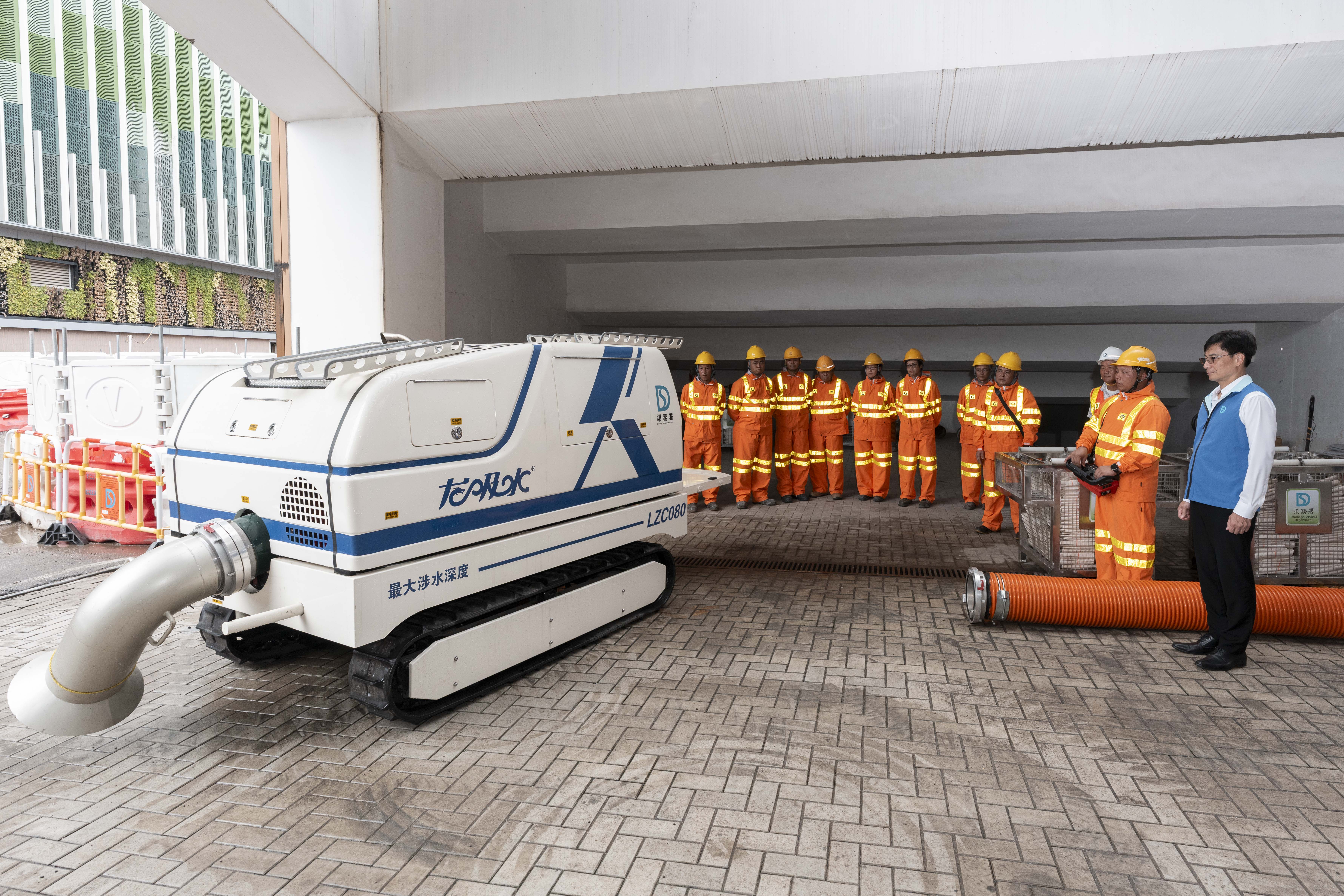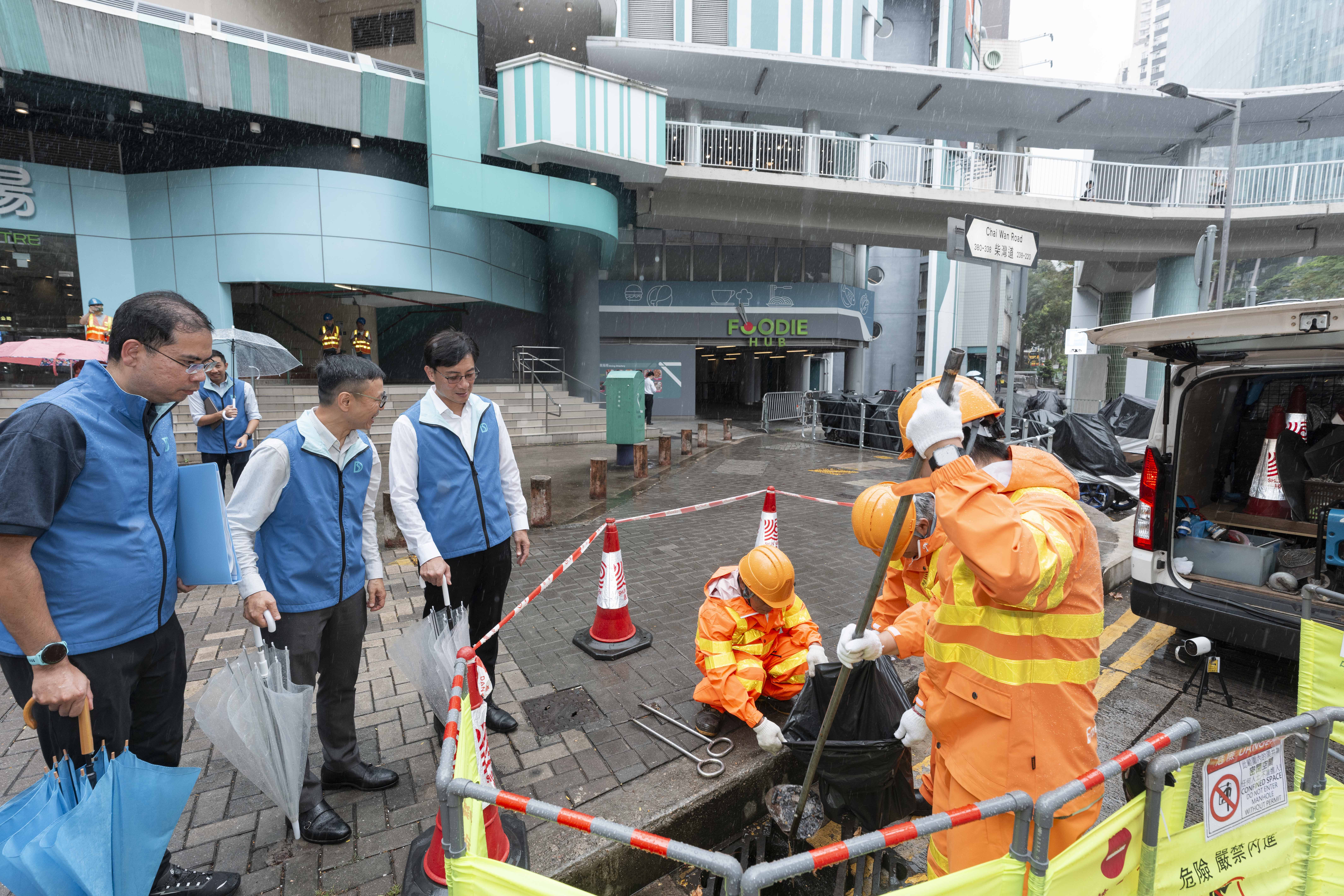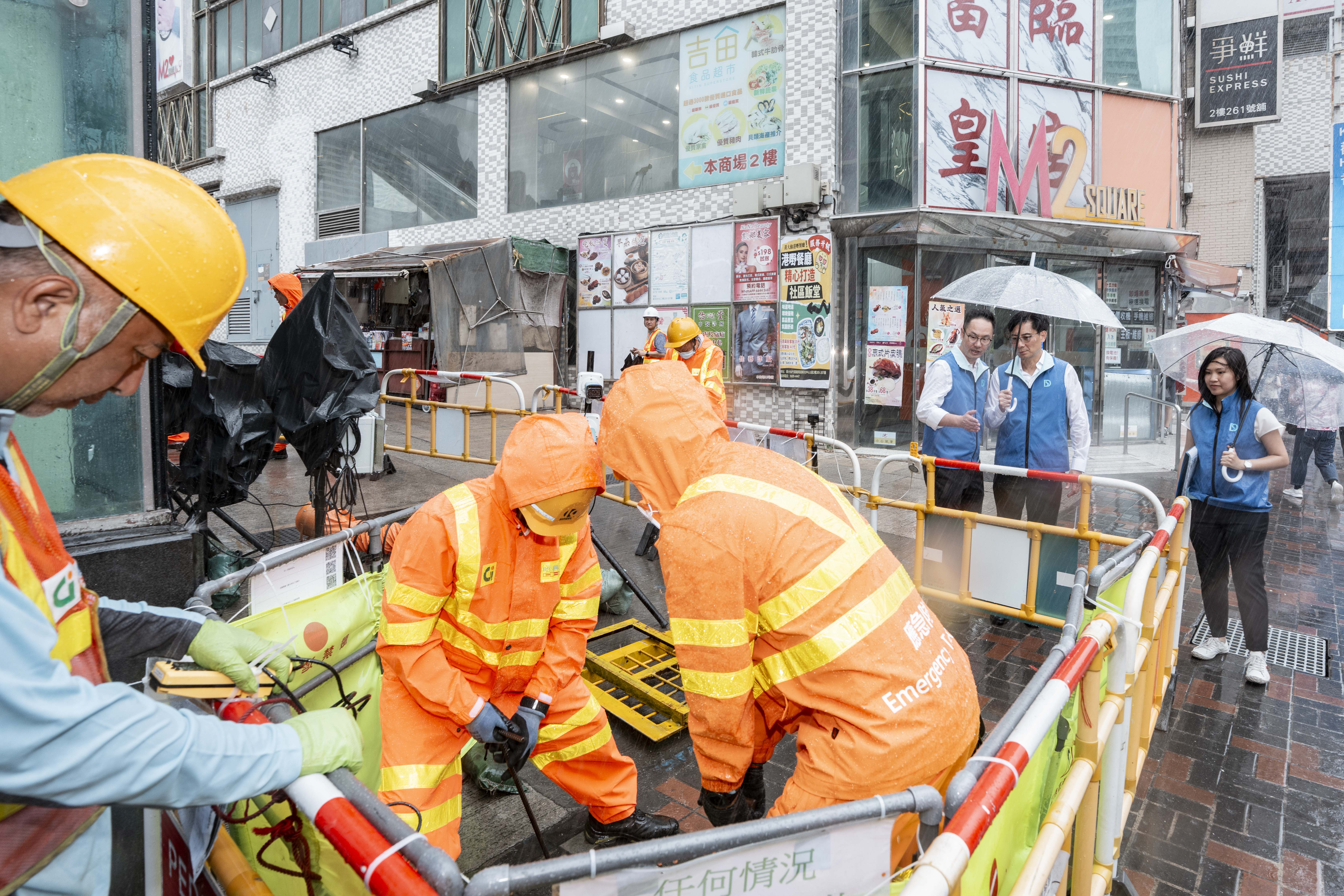 莫永昌与部门管理层分别视察了柴湾道回旋处的组合泵系统、杏花邨安装可拆卸式挡水板演习、黄大仙龙翔道行车道中央分隔栏加设的排水孔、经优化的排水沙井井盖及涉水线系统试验计划。他亦有巡视强力排水机械人「龙吸水」及「小禹一号」,确保防洪设备已准备就绪。
