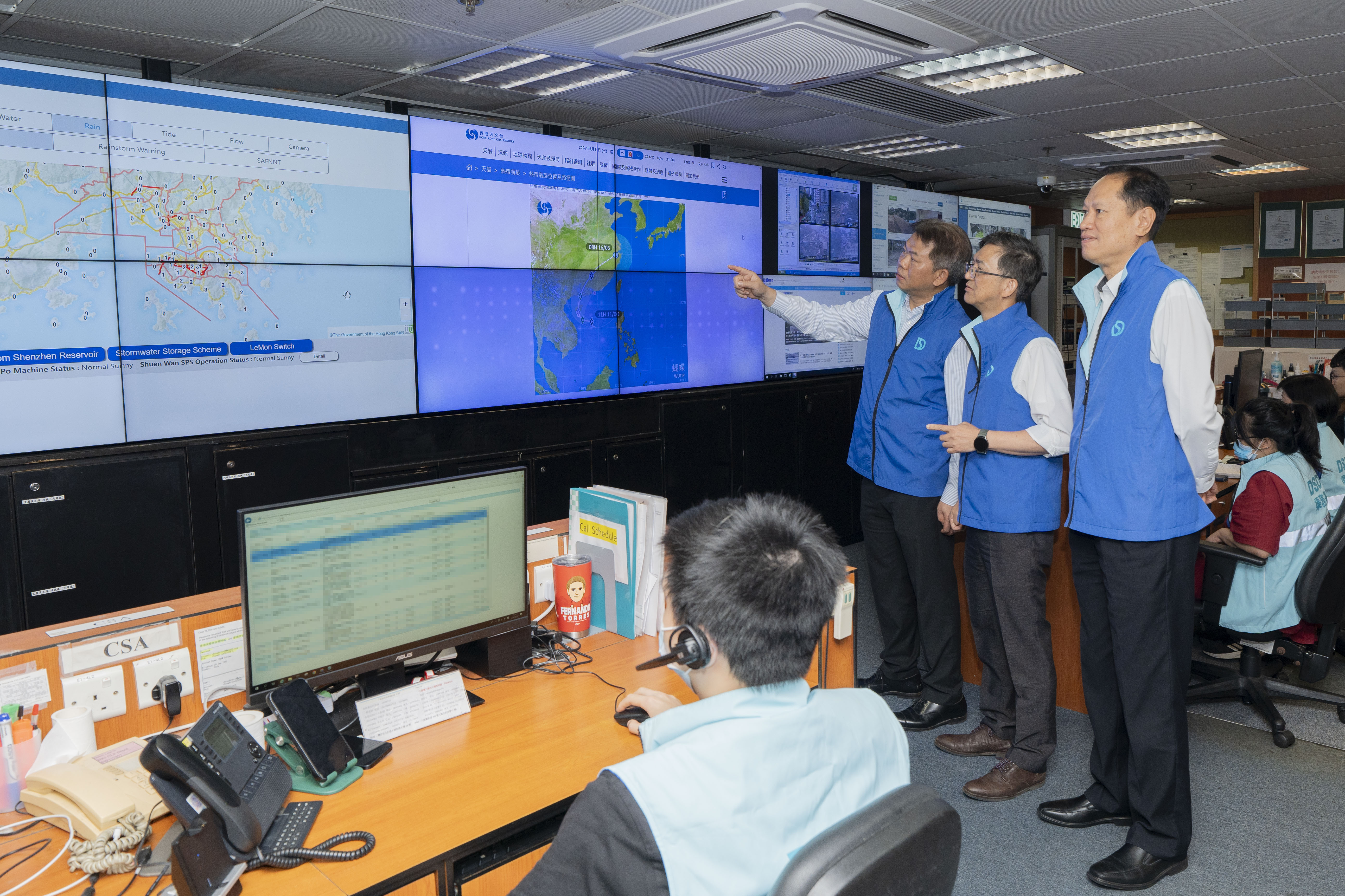 渠务署官员六月十一日视察曾发生较严重水浸事故的地点,了解部门实施的防洪措施。图示署理渠务署副署长李伟文(右三)、渠务署助理署长/操作维修刘胜昌(右二)及渠务署高级系统顾问徐仕基(右一)到访紧急事故控制中心,了解中心应对台风及水浸风险的工作。