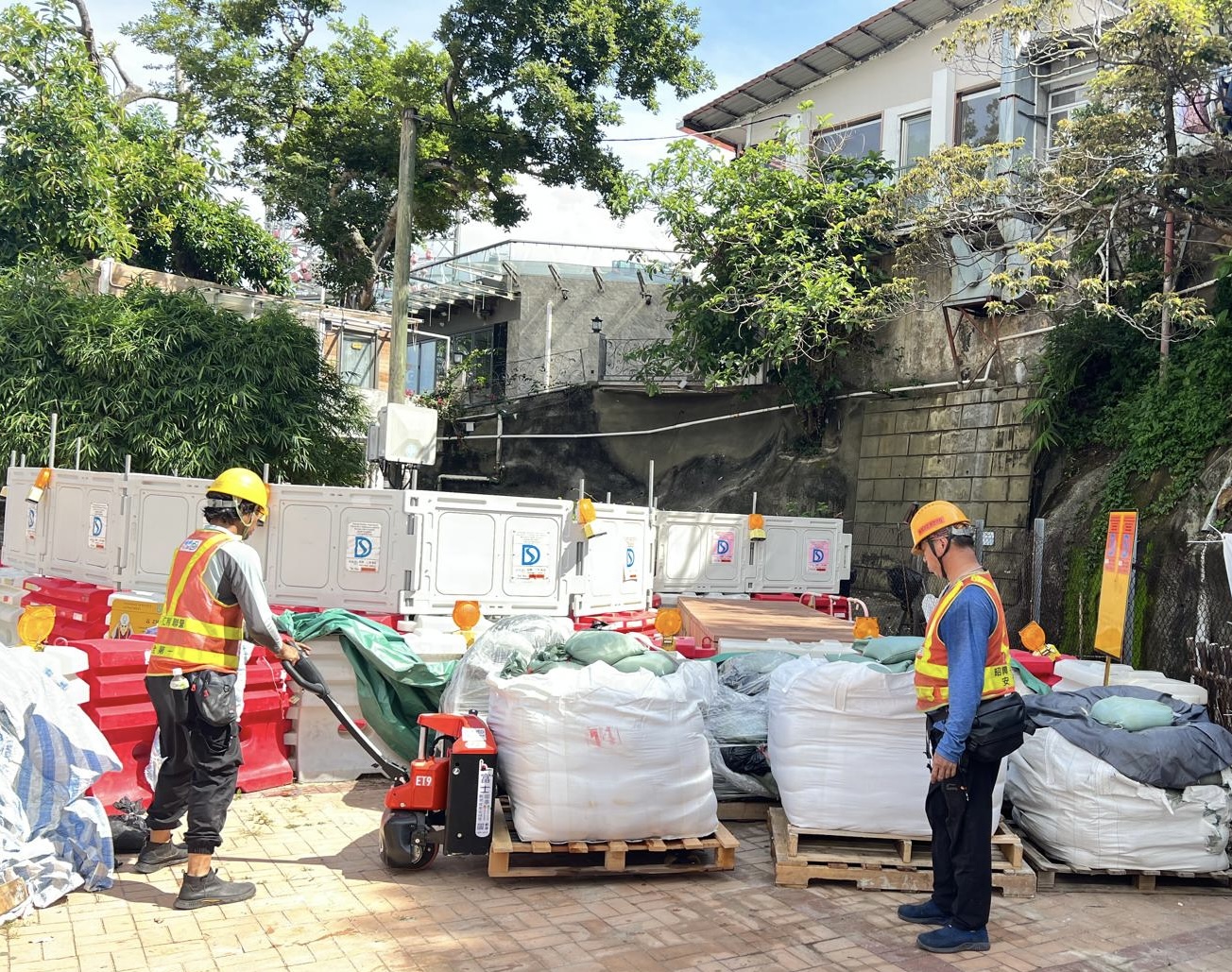 渠务署官员六月十一日视察曾发生较严重水浸事故的地点,了解部门实施的防洪措施。图示渠务署人员于鲤鱼门为居民提供沙包。