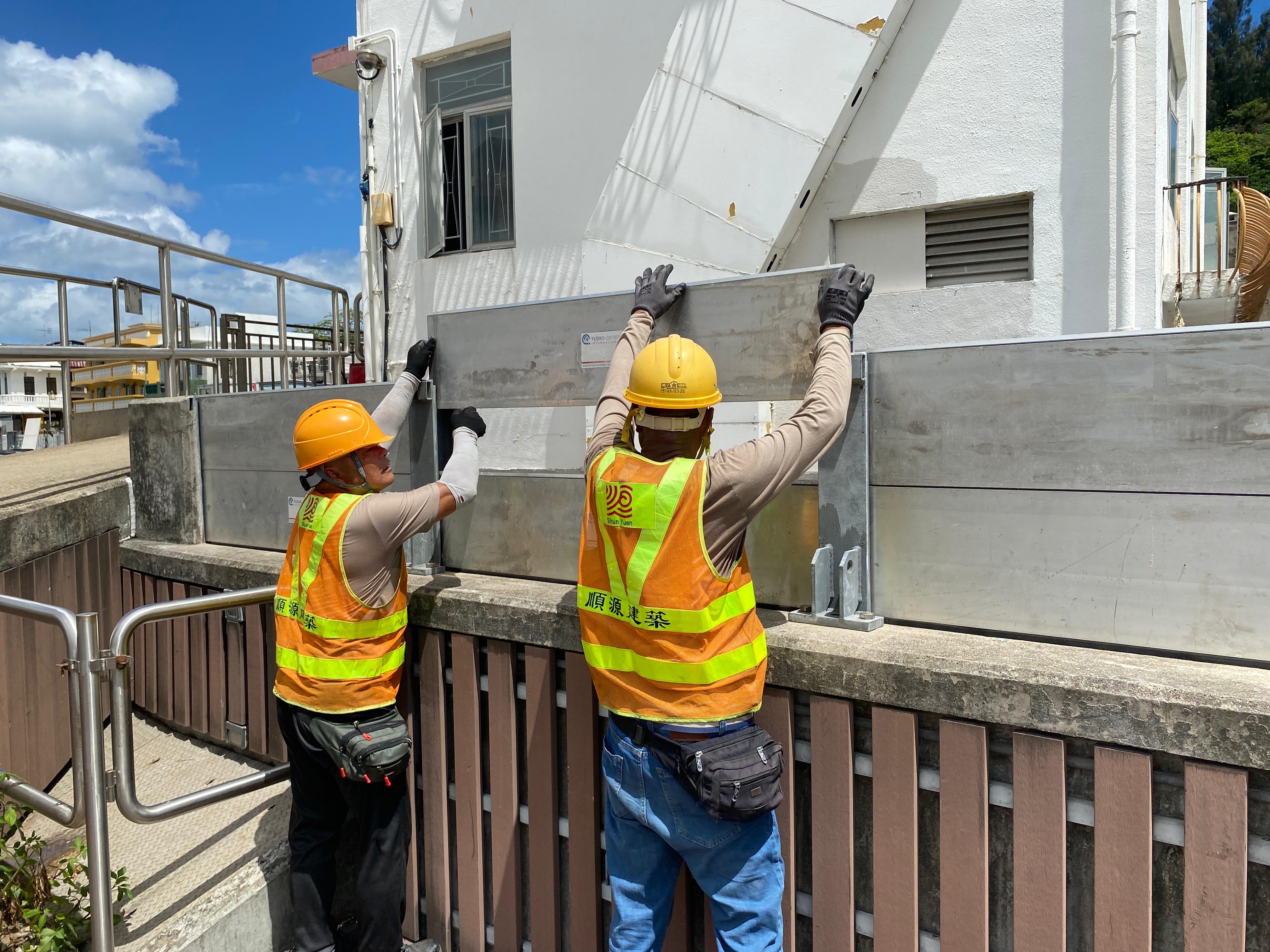 渠务署官员六月十一日视察曾发生较严重水浸事故的地点,了解部门实施的防洪措施。图示渠务署人员于大澳安装可拆卸式挡水板。