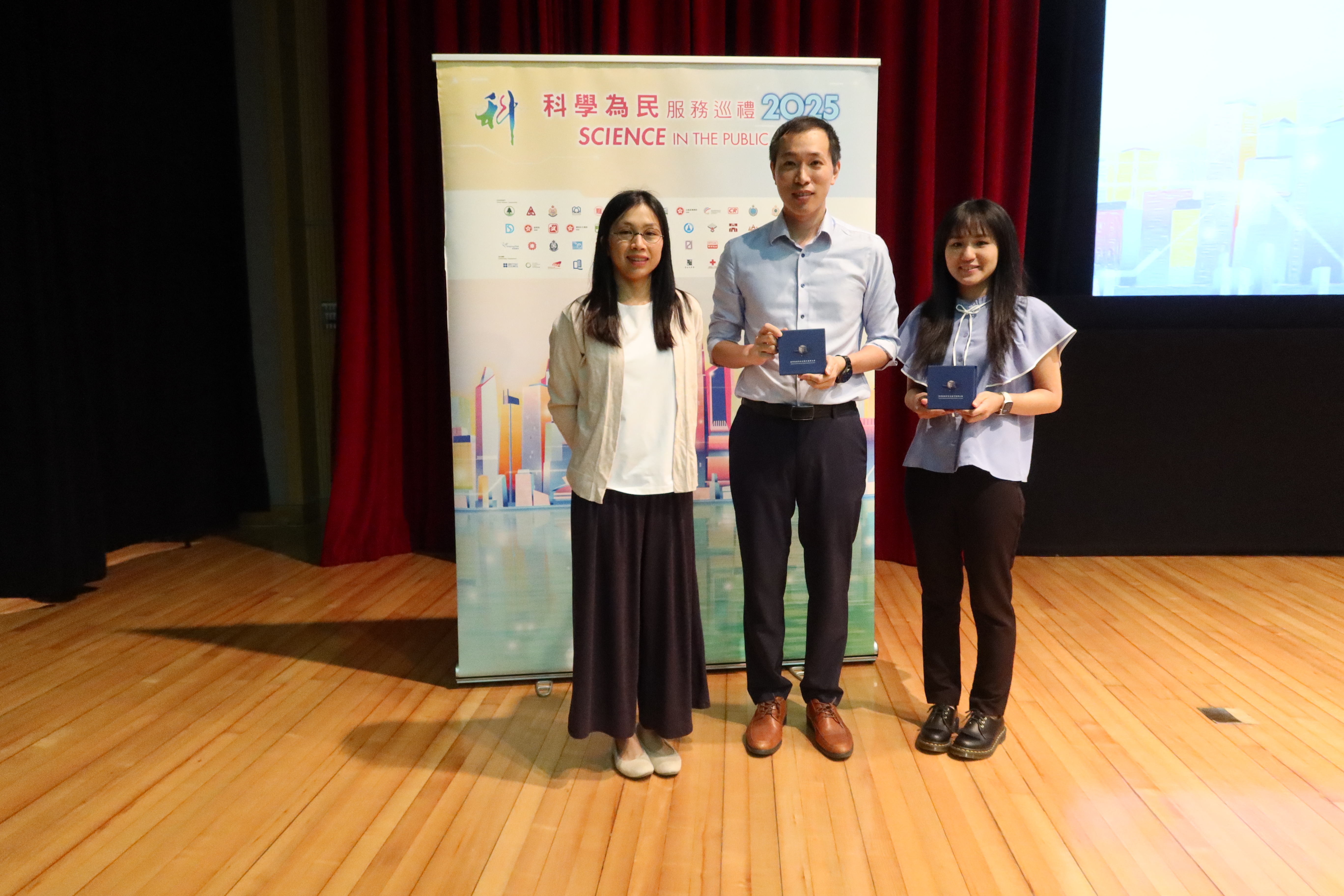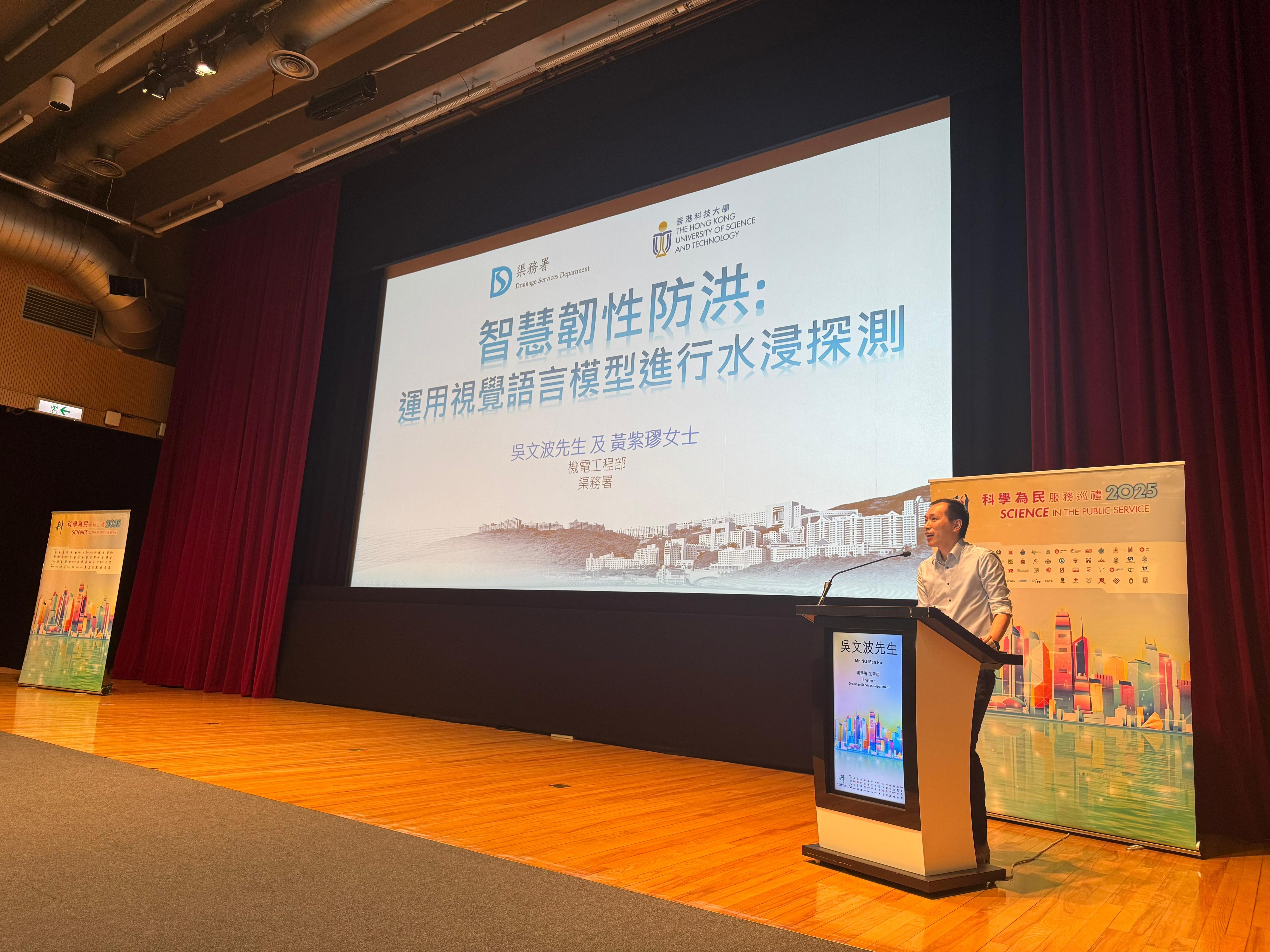 渠务署工程师吴文波先生及黄紫璆女士,于2025年10月18日在香港科学馆举行的「科学为民」讲座上,介绍了一项名为「人工智能水浸监测系统」的崭新的智慧韧性防洪方案。