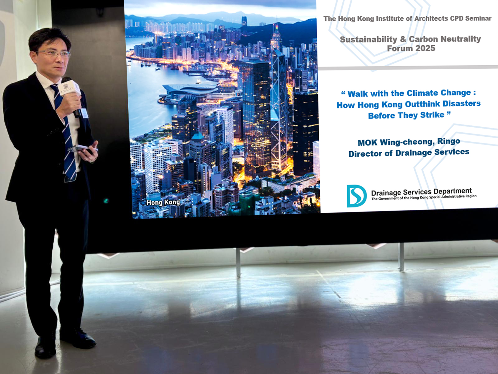 渠务署署长莫永昌先生于2025年12月13日出席了由香港建筑师学会主办的《碳中和与可持续发展论坛2025》。该论坛为交流应对气候韧性策略及推动合作提供了宝贵的平台,促进香港迈向可持续及具备气候变化应对能力的未来。论坛汇聚了政府代表(包括气候变化专员)、香港大学及香港中文大学的专家,以及建筑师、工程顾问与电力供应业界代表。