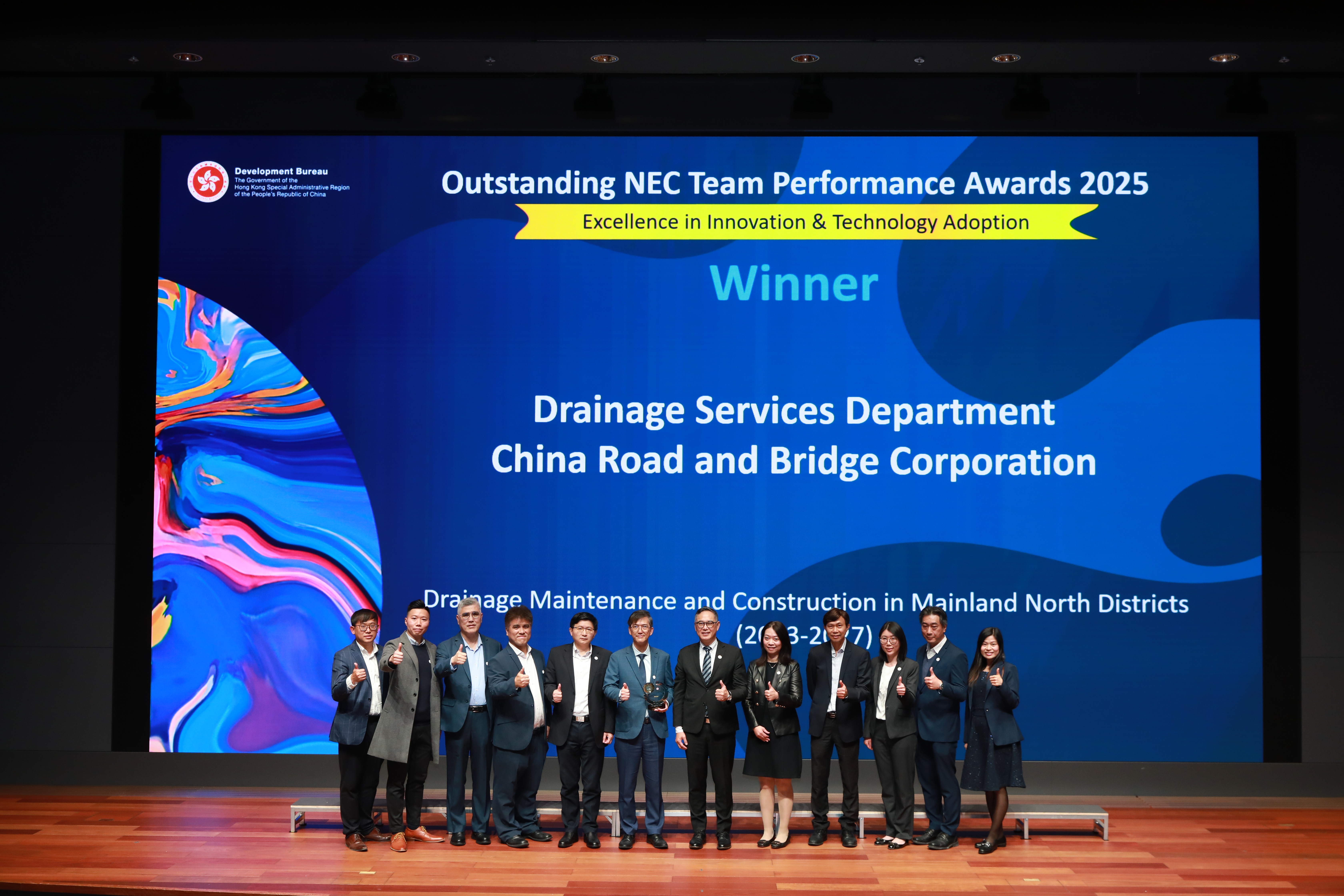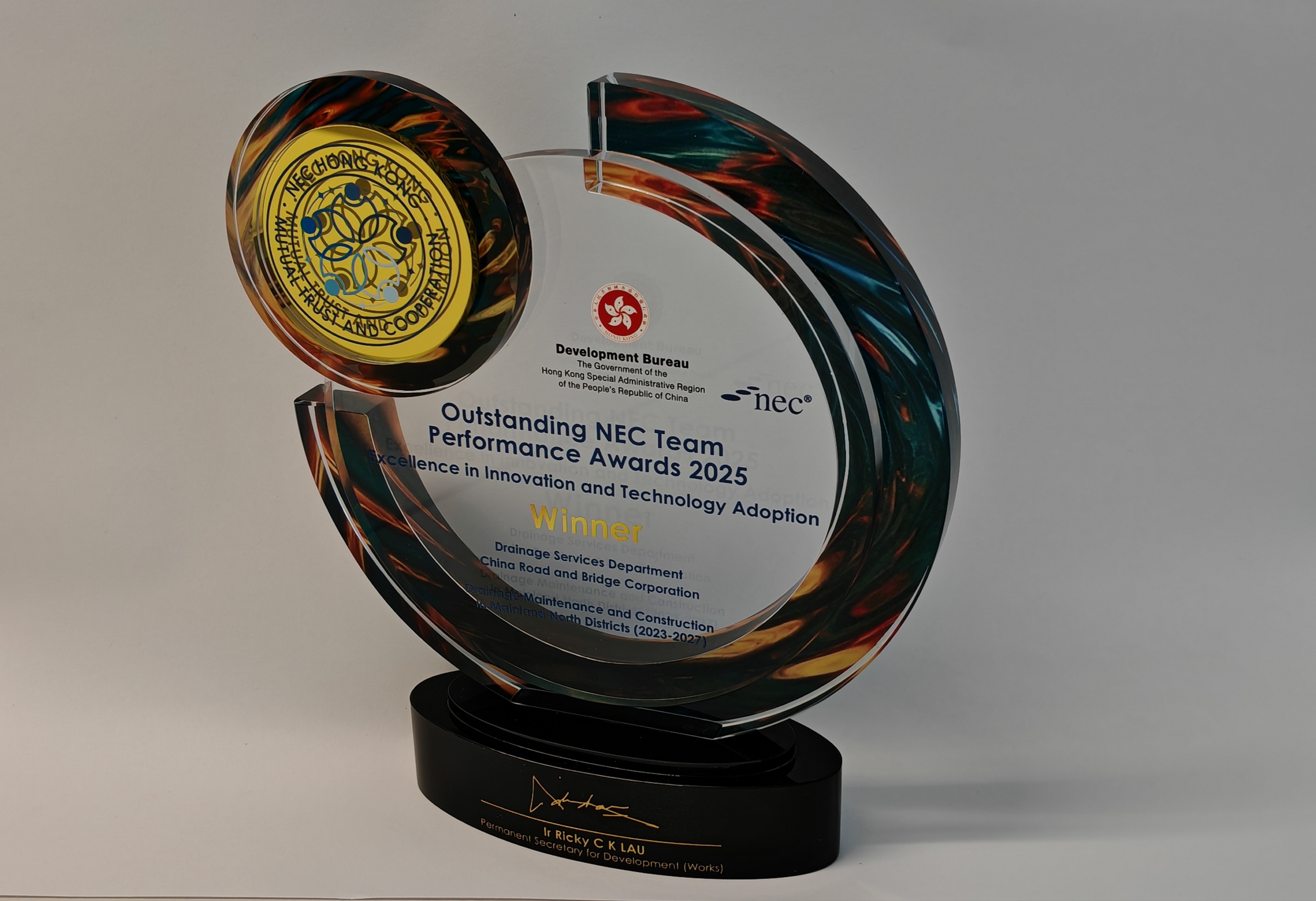渠务署于发展局举办的首届「优秀NEC团队表现奖」中,凭藉「新界北区的渠务维修及建造工程(2023-2027)」工程团队的卓越表现,荣获「卓越创新科技应用奖」大奖,充分展现本署在推动「新工程合约」(NEC)模式及创新科技应用方面的卓越成就。