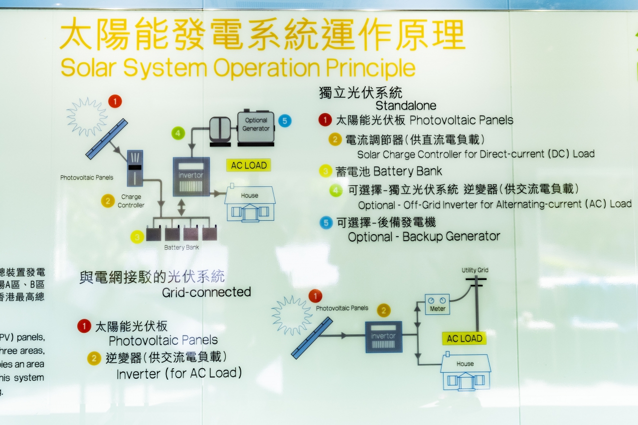 太陽能發電場由三個主要發電場區(A 、B及C區)和廠內其他設施組成,其中B區的太陽能光伏板最多,共約有2,700塊,佔地面積為7,200平方米,最高產電量為694千瓦,大約佔發電場總產電量百分之58。而A區和C區則分別由約700塊和900塊太陽能光伏板組成。
