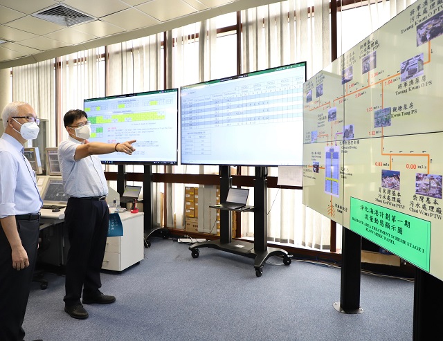 環境及生態局局長謝展寰和副局長黃淑嫻今日(九月七日)到訪渠務署昂船洲污水處理廠,了解部門的工作。圖示謝展寰(左)聽取渠務署人員講解污水處理廠中央控制室的日常運作。