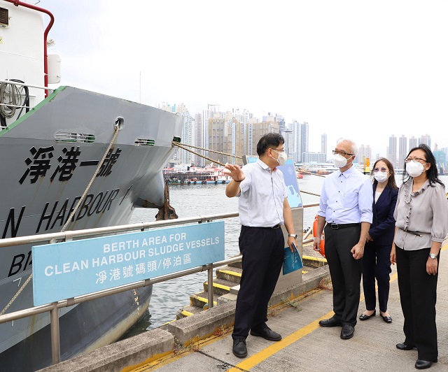 環境及生態局局長謝展寰和副局長黃淑嫻今日(九月七日)到訪渠務署昂船洲污水處理廠,了解部門的工作。圖示謝展寰(左二)和黃淑嫻(右二)在渠務署署長彭雅妮(右一)的陪同下視察為「淨化海港計劃」第二期甲工程而建造的運送污泥船「淨港一號」。