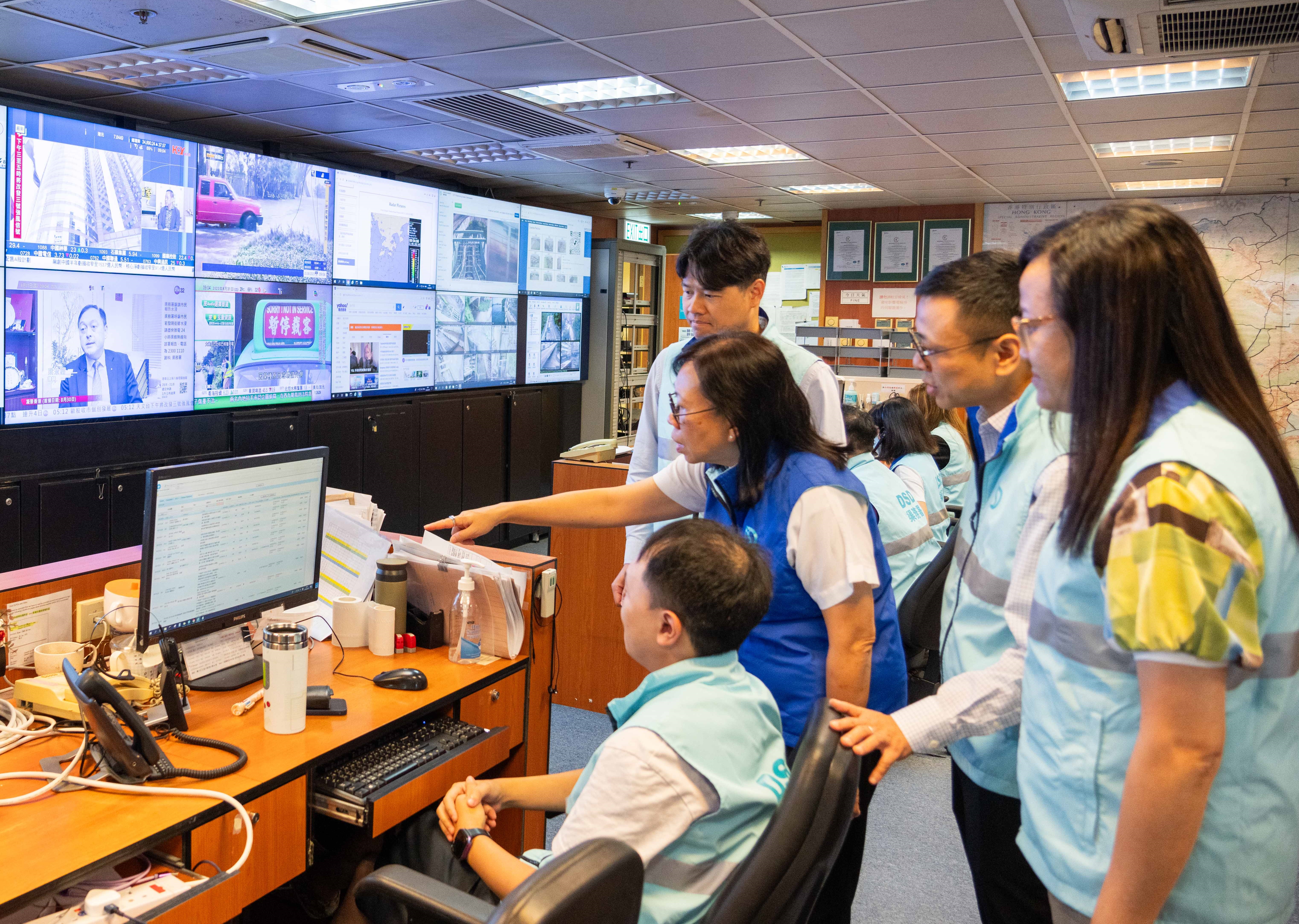 渠務署署長彭雅妮(右三)今日(八月三十一日)到訪及檢視渠務署後備緊急事故控制中心,並透過實時監控系統了解主要排水系統的實時狀況,確保防洪設施正常運作。