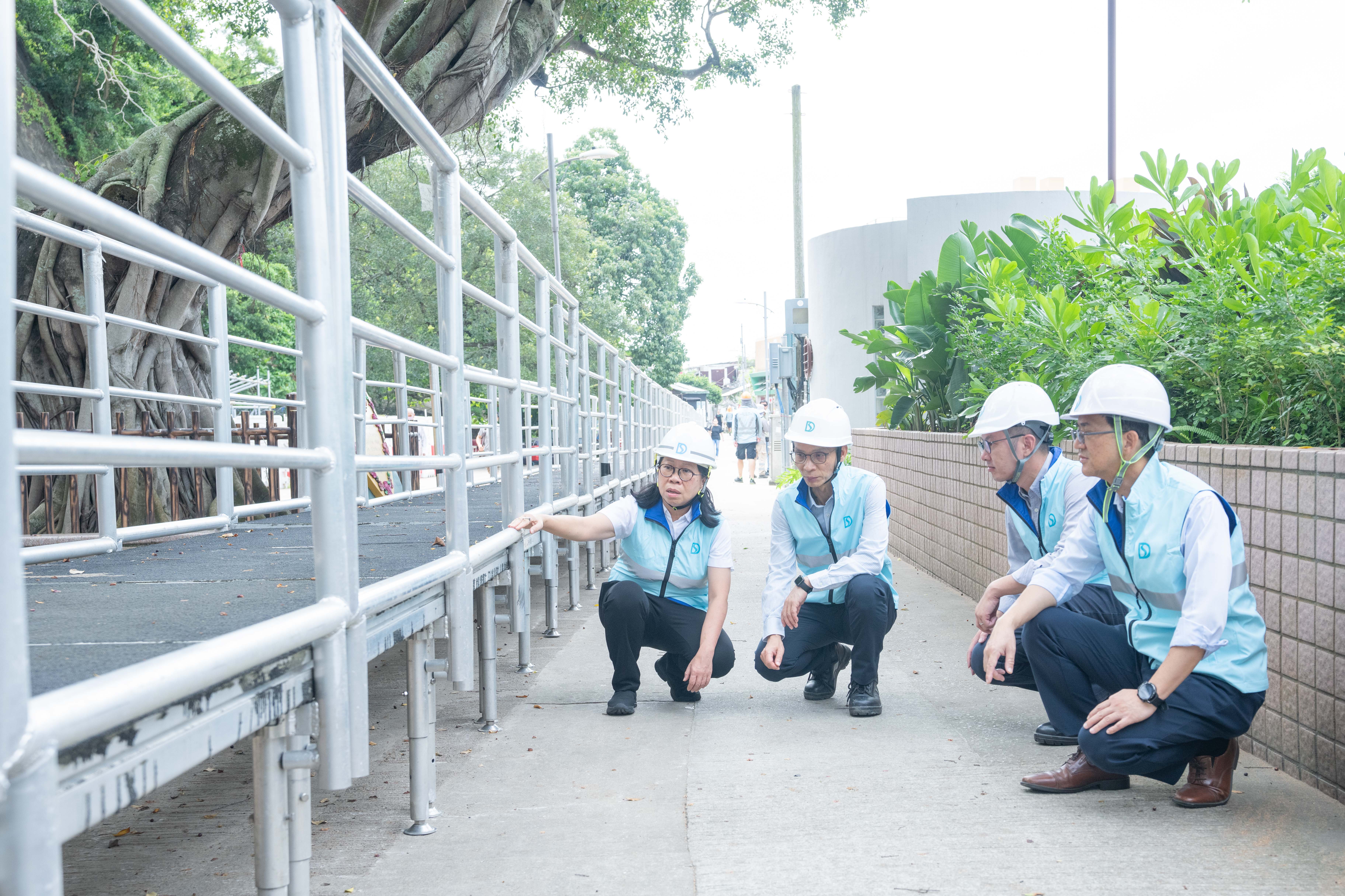 渠務署署長彭雅妮今日(八月三十一日)視察較高風險的沿岸低窪或當風地區,了解部門應對風暴潮措施的進度。圖示彭雅妮(左一)視察在鯉魚門設置的臨時行人通道平台。