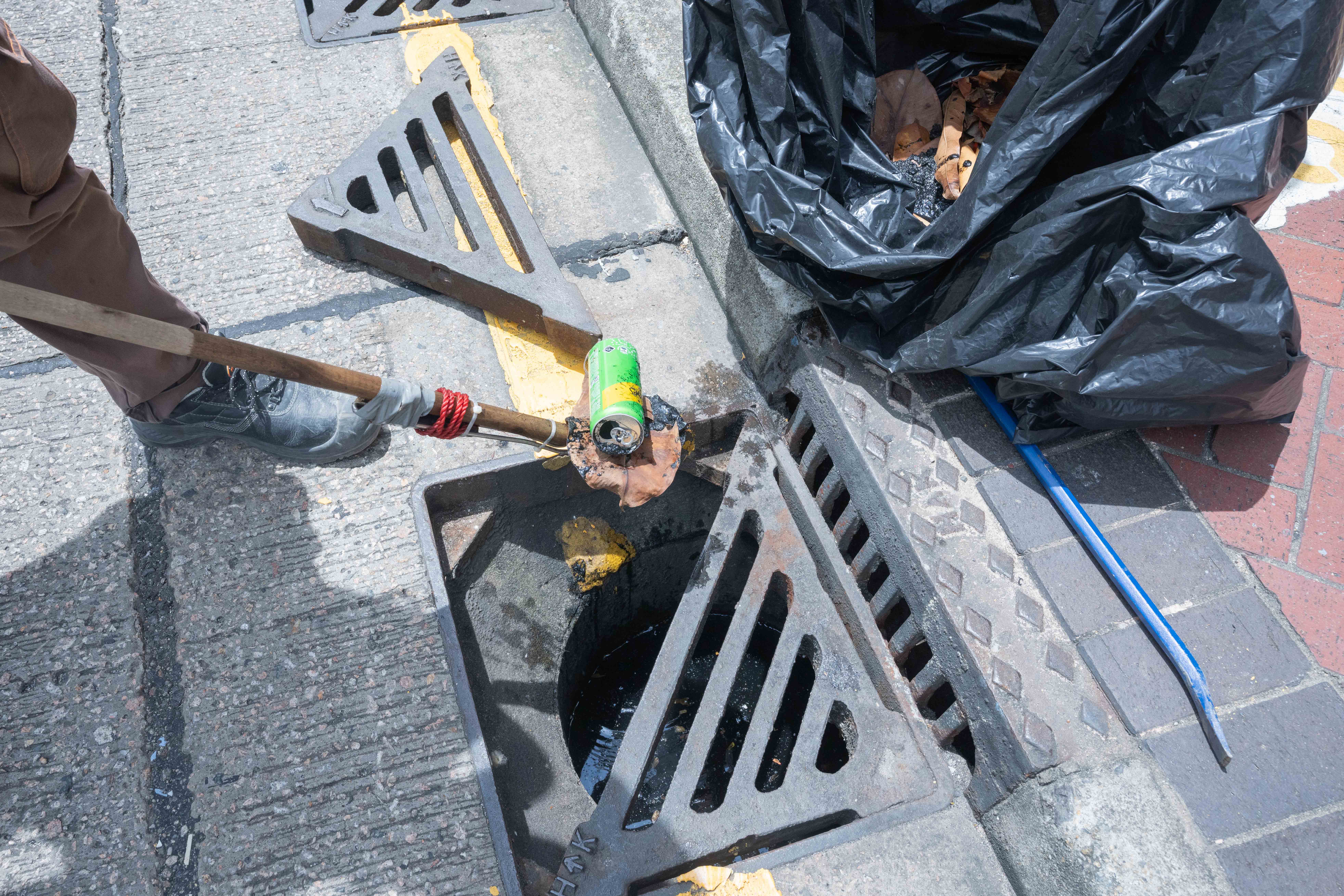 渠務署前線同事今日(八月三十一日)在漆咸道南的集水溝清出大量雜物。
