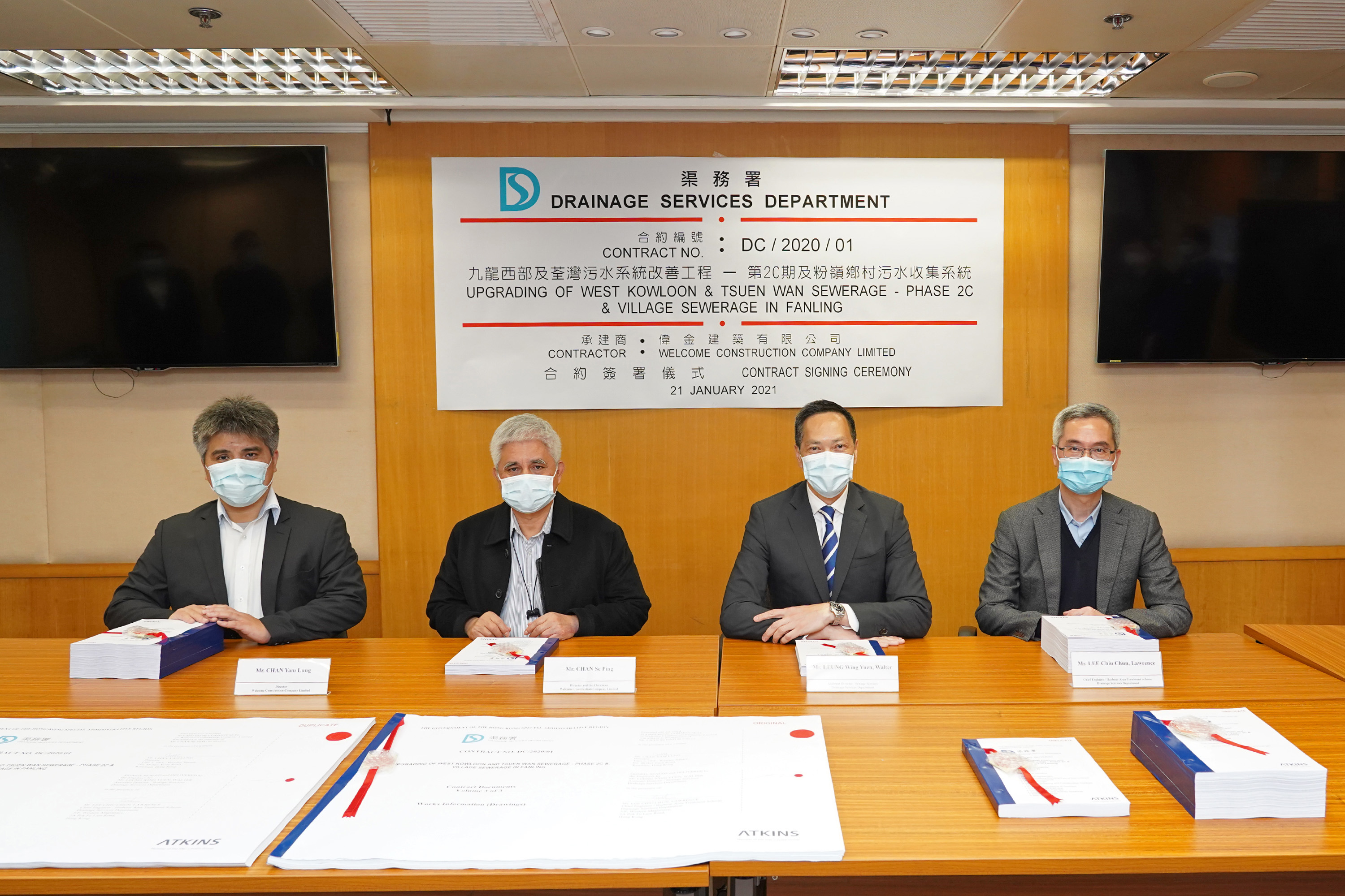 渠務署助理署長/污水處理服務梁泳源先生(右二)與偉金建築有限公司董事及主席陳詩坪先生(左二)出席合約簽約儀式